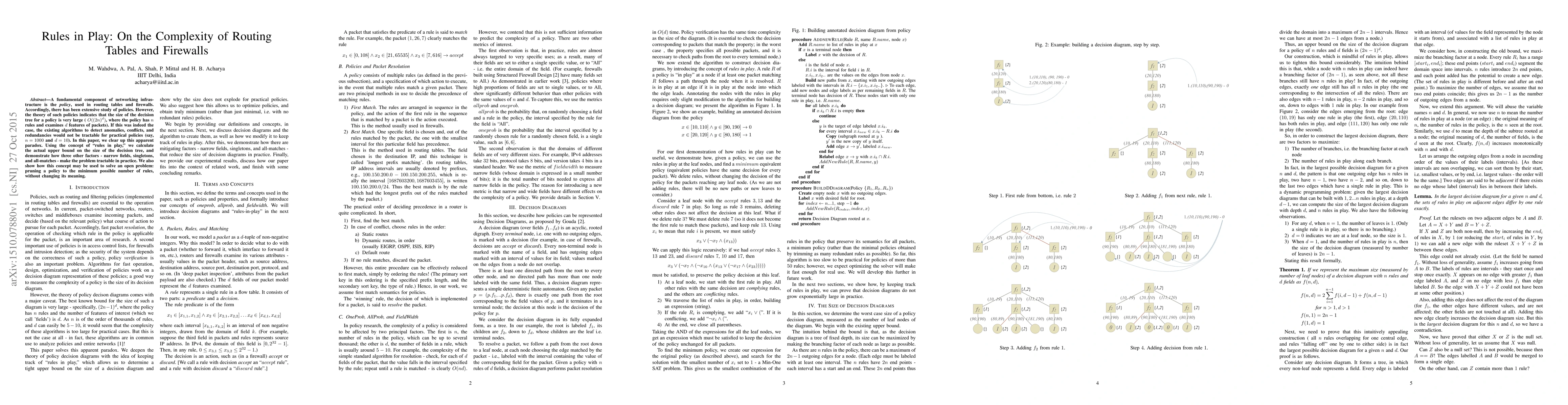 This paper resolves a discrepancy in policy theory for routing tables and firewalls, revealing that the actual size of decision trees is much smaller than previously thought due to 'rules in play', narrow fields, singletons, and all-matches. It also presents a method to minimize policy rules without altering their meaning.