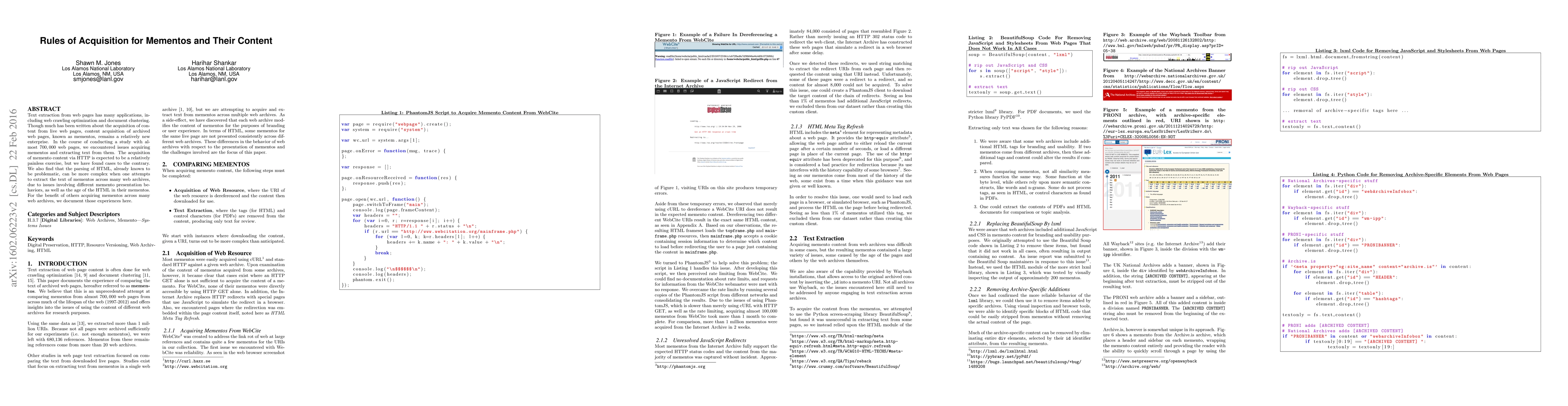 Researchers studied extracting text from archived web pages (mementos) and found issues with parsing HTML due to varied presentation behaviors and aging HTML content. They documented their experiences to help others acquire memento content across multiple web archives.