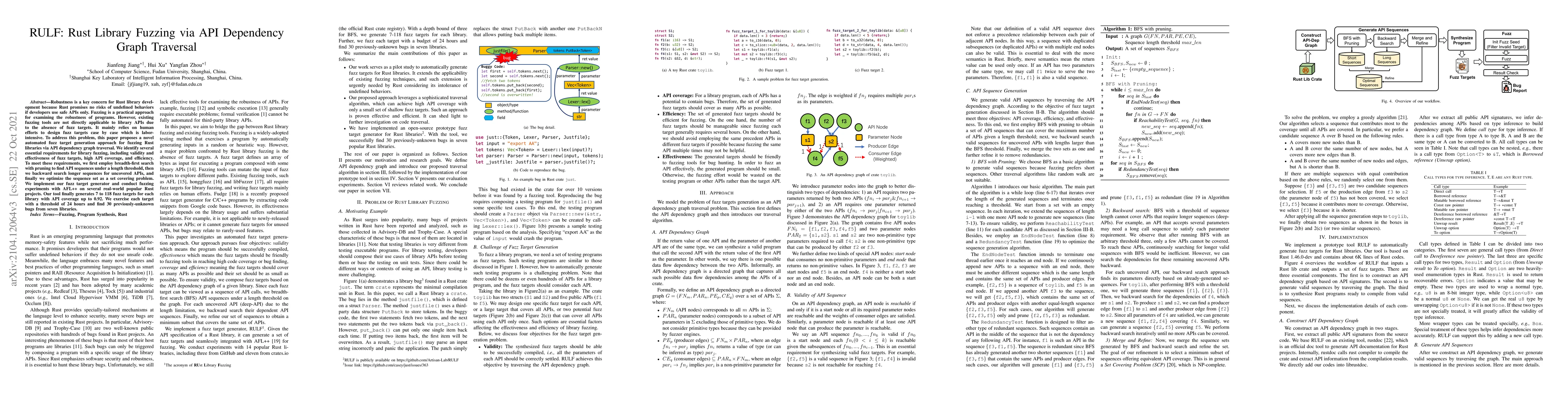 This paper proposes RULF, an automated fuzz target generation tool for Rust libraries using API dependency graph traversal, addressing the labor-intensive process of manual fuzz target design. The tool achieves high API coverage and efficiency through breadth-first search, backward search, and set covering optimization, uncovering 30 previously unknown bugs in popular Rust projects.