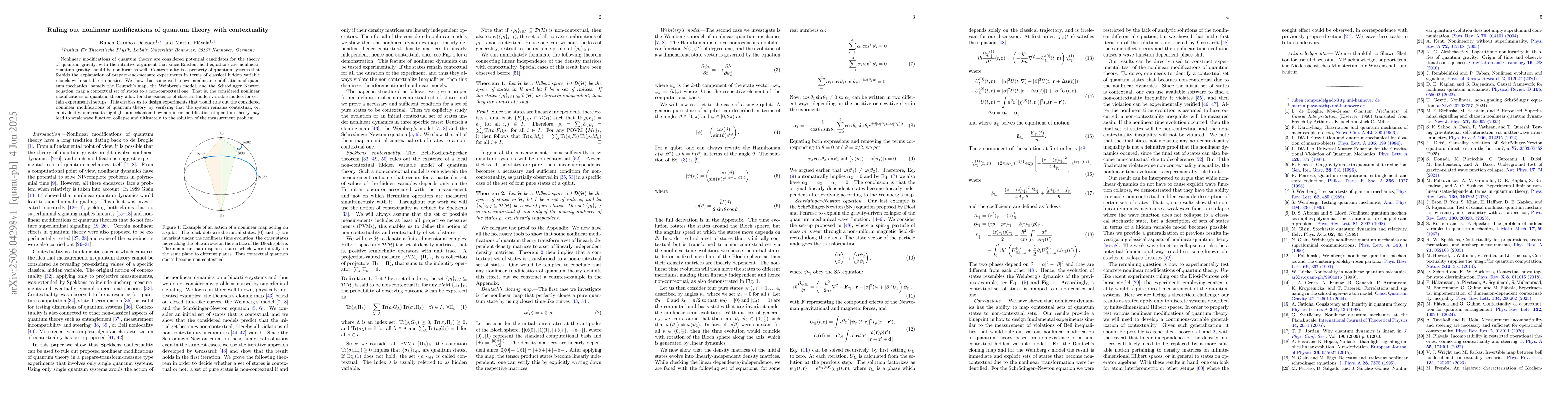 Nonlinear modifications of quantum theory are considered potential candidates for the theory of quantum gravity, with the intuitive argument that since Einstein field equations are nonlinear, quantum gravity should be nonlinear as well. Contextuality is a property of quantum systems that forbids the explanation of prepare-and-measure experiments in terms of classical hidden variable models with suitable properties. We show that some well-known nonlinear modifications of quantum mechanics, namely the Deutsch's map, the Weinberg's model, and the Schr\"odinger - Newton equation, map a contextual set of states to a non-contextual one. That is, the considered nonlinear modifications of quantum theory allow for the existence of classical hidden variable models for certain experimental setups. This enables us to design experiments that would rule out the considered nonlinear modifications of quantum theory by verifying that the system remains contextual, or, equivalently, our results highlight a mechanism how nonlinear modification of quantum theory may lead to weak wave function collapse and ultimately to the solution of the measurement problem.