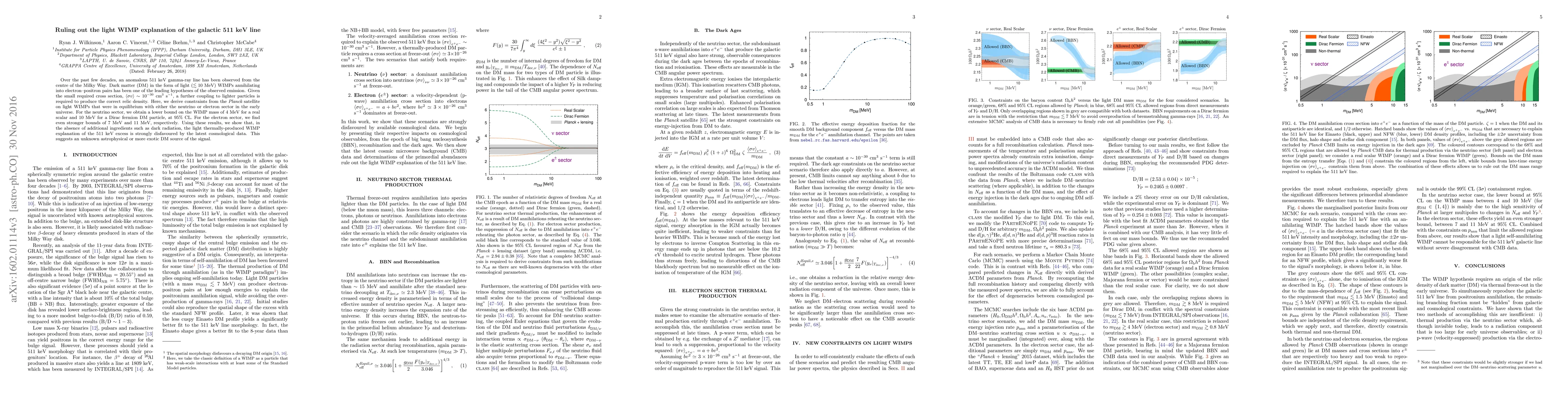 Over the past few decades, an anomalous 511 keV gamma-ray line has been observed from the centre of the Milky Way. Dark matter (DM) in the form of light weakly interacting massive particles (WIMPs) annihilating into electron-positron pairs has been one of the leading hypotheses of the observed emission. Given the small required cross section, a further coupling to lighter particles is required to produce the correct relic density. Here, we derive constraints from the Planck satellite on light WIMPs that were in equilibrium with either the neutrino or electron sector in the early universe. For the neutrino sector, we obtain a lower bound on the WIMP mass of 4 MeV for a real scalar and 10 MeV for a Dirac fermion DM particle, at 95% CL. For the electron sector, we find even stronger bounds of 7 and 11 MeV, respectively. Using these results, we show that, in the absence of additional ingredients such as dark radiation, the light thermally produced WIMP explanation of the 511 keV excess is strongly disfavoured by the latest cosmological data. This suggests an unknown astrophysical or more exotic DM source of the signal.