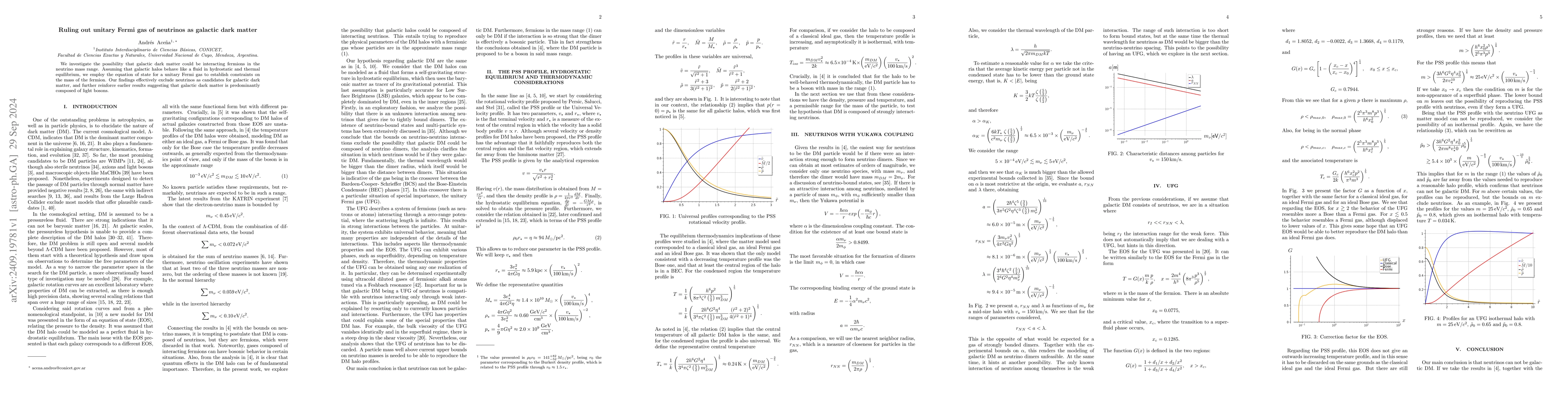 Summary: The study examines whether neutrinos, as unitary Fermi gases, could constitute galactic dark matter. It concludes that neutrinos do not fit the criteria for dark matter, supporting the hypothesis that dark matter is primarily composed of light bosons instead.