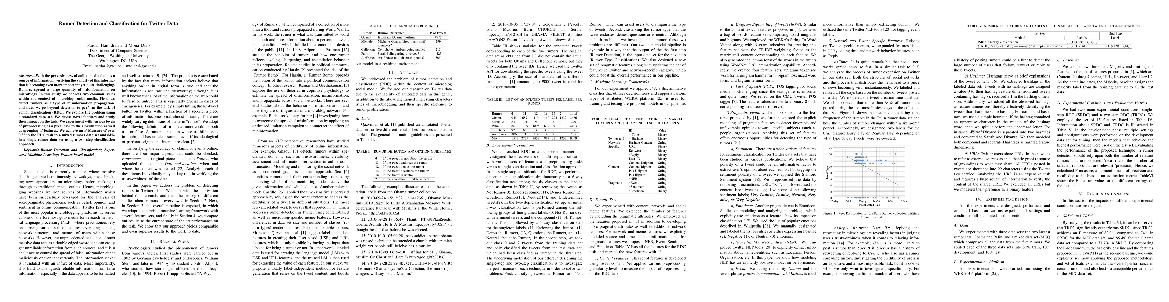 This paper presents a method for detecting and classifying rumors on Twitter, addressing the challenge of misinformation spread. It achieves an f-measure of over 0.82 for mixed rumor datasets and 84 percent for single rumor datasets using a two-step classification approach with novel features and preprocessing techniques.
