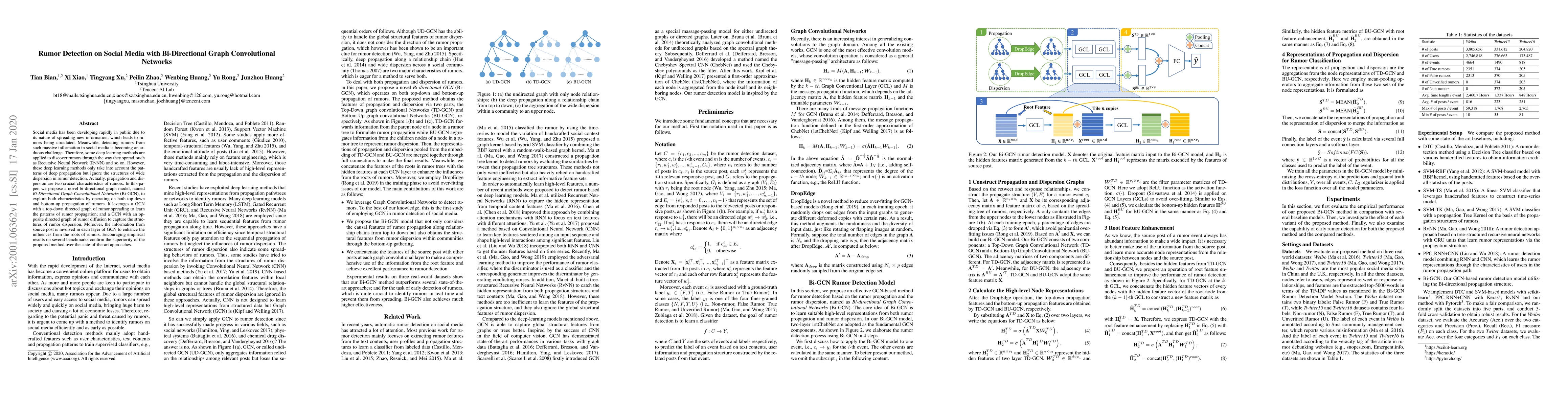 This paper proposes Bi-Directional Graph Convolutional Networks (Bi-GCN) to detect rumors on social media by considering both rumor propagation and dispersion patterns. The method uses GCNs on directed graphs to analyze top-down and bottom-up rumor spread, enhancing performance by incorporating source post information. Empirical results show Bi-GCN outperforms existing deep learning methods.