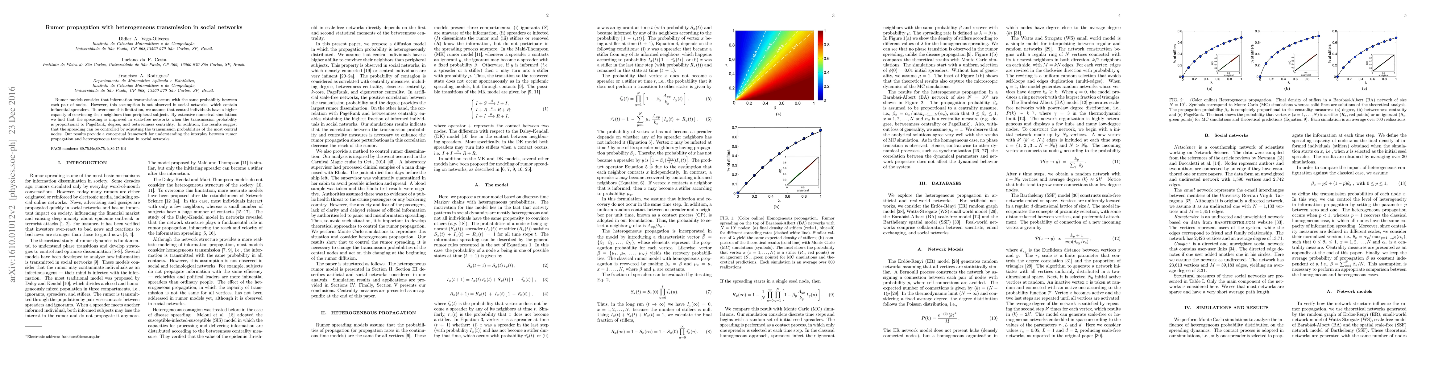 The work distinguishes itself by considering heterogeneous transmission probabilities based on node centrality measures, revealing their significant impact on rumor spreading in social networks.