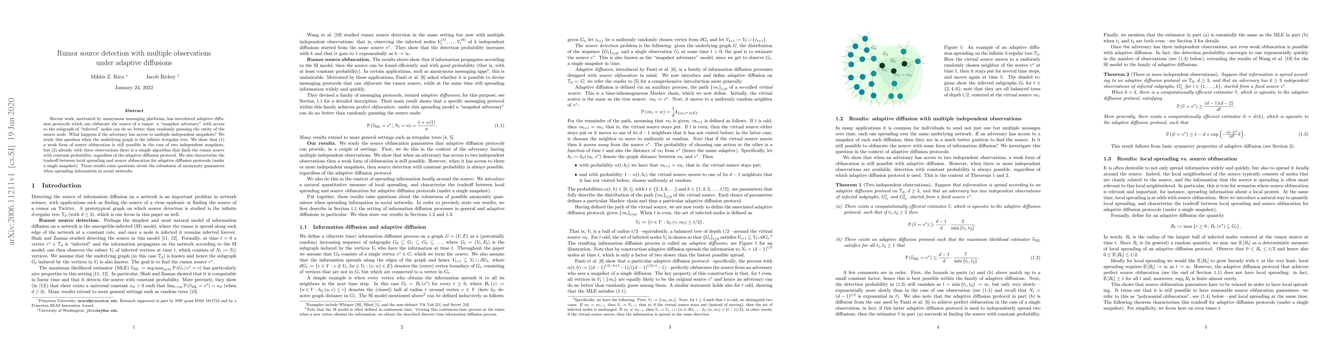 This paper explores adaptive diffusion protocols for rumor source detection on an infinite $d$-regular tree, showing that while two snapshots provide weak source obfuscation, three snapshots allow for reliable source identification. It also examines the balance between local spreading and source obfuscation under single snapshot conditions.