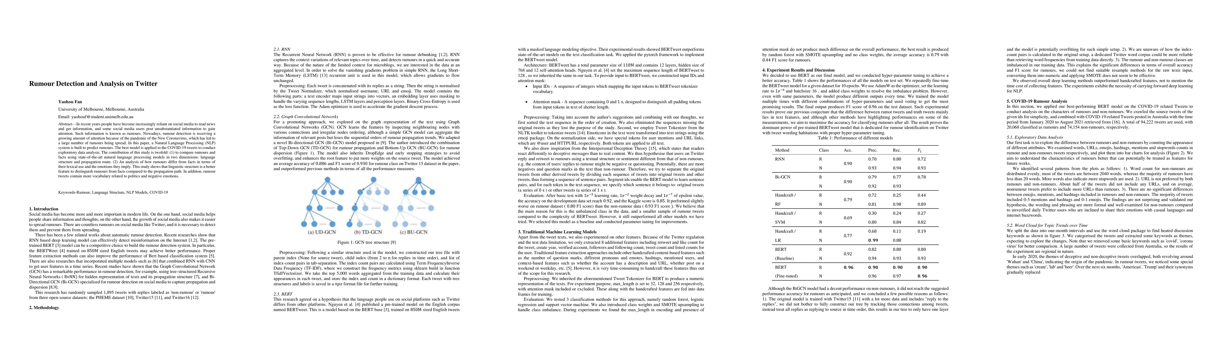 This paper develops an NLP system to detect rumours on Twitter, comparing rumours and facts using language structure and propagation route. Findings indicate that linguistic features are more effective than propagation paths in distinguishing rumours, with rumours showing higher use of political vocabulary and negative emotions.