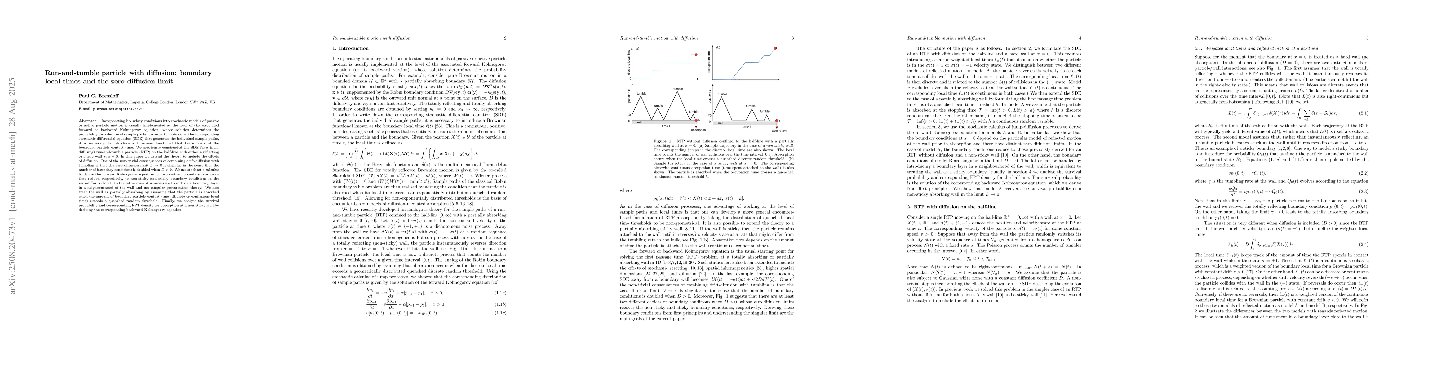 Incorporating boundary conditions into stochastic models of passive or active particle motion is usually implemented at the level of the associated forward or backward Kolmogorov equation, whose solution determines the probability distribution of sample paths. In order to write down the corresponding stochastic differential equation (SDE) that generates the individual sample paths, it is necessary to introduce a Brownian functional that keeps track of the boundary-particle contact time. We previously constructed the SDE for a (non-diffusing) run-and-tumble particle (RTP) on the half-line with either a reflecting or sticky wall at $x=0$. In this paper we extend the theory to include the effects of diffusion. One of the non-trivial consequences of combining drift-diffusion with tumbling is that the zero diffusion limit $D\rightarrow 0$ is singular in the sense that the number of boundary conditions is doubled when $D>0$. We use stochastic calculus to derive the forward Kolmogorov equation for two distinct boundary conditions that reduce, respectively, to non-sticky and sticky boundary conditions in the zero-diffusion limit. In the latter case, it is necessary to include a boundary layer in a neighbourhood of the wall and use singular perturbation theory. We also treat the wall as partially absorbing by assuming that the particle is absorbed when the amount of boundary-particle contact time (discrete or continuous local time) exceeds a quenched random threshold. Finally, we analyse the survival probability and corresponding FPT density for absorption at a non-sticky wall by deriving the corresponding backward Kolmogorov equation