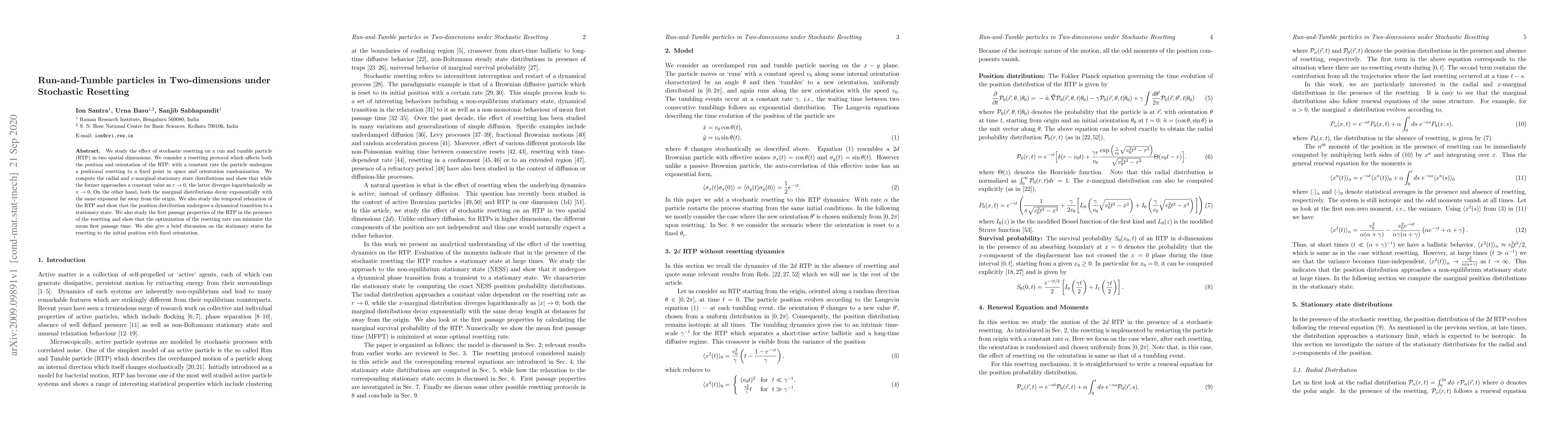 This paper investigates the impact of stochastic resetting on run-and-tumble particles in two dimensions, finding that the radial distribution approaches a constant near the origin while the $x$-marginal diverges logarithmically. The study also explores the first passage properties and optimization of resetting rates to minimize mean first passage time.