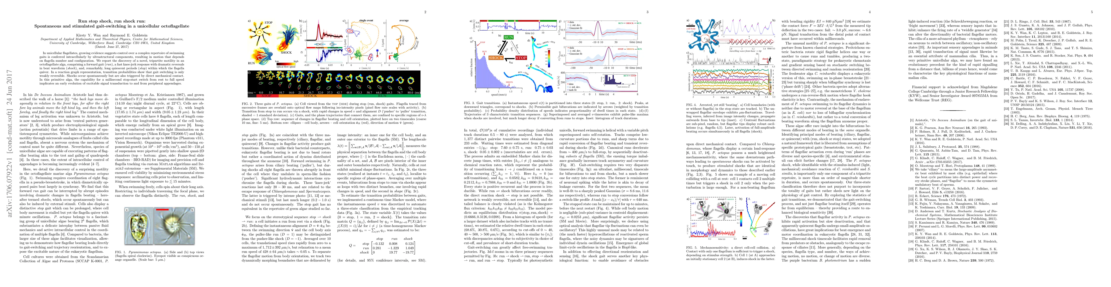 In unicellular flagellates, growing evidence suggests control over a complex repertoire of swimming gaits is conferred intracellularly by ultrastructural components, resulting in motion that depends on flagella number and configuration. We report the discovery of a novel, tripartite motility in an octoflagellate alga, comprising a forward gait ($run$), a fast knee-jerk response with dramatic reversals in beat waveform ($shock$), and, remarkably, long quiescent periods ($stop$) within which the flagella quiver. In a reaction graph representation, transition probabilities show that gait switching is only weakly reversible. Shocks occur spontaneously but are also triggered by direct mechanical contact. In this primitive alga, the capability for a millisecond stop-start switch from rest to full speed implicates an early evolution of excitable signal transduction to and from peripheral appendages.