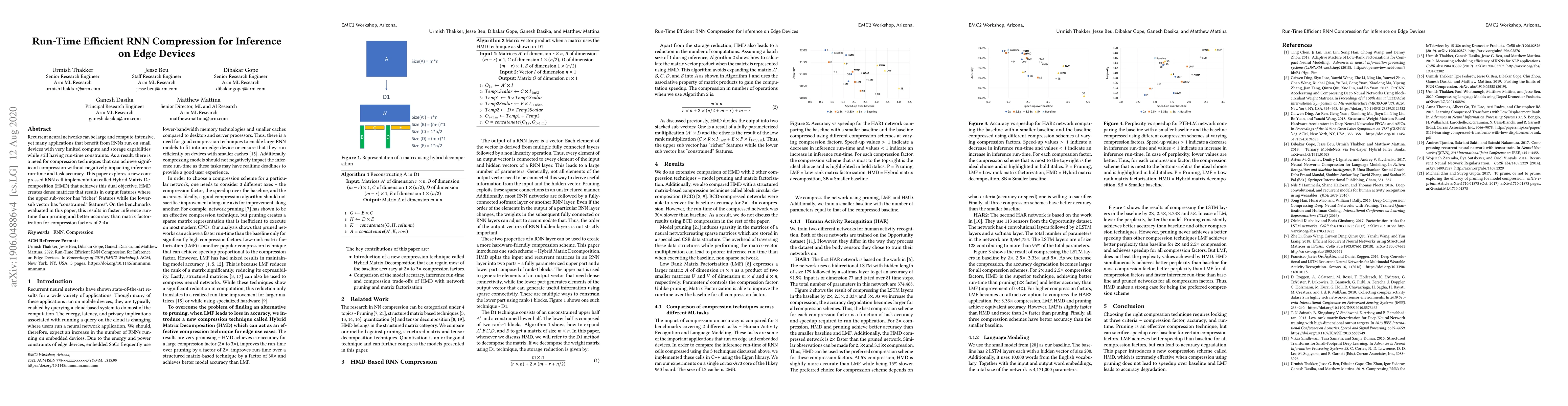 This paper proposes a Hybrid Matrix Decomposition (HMD) method for compressing RNNs to run efficiently on edge devices, achieving 2-4x compression while maintaining faster run-time and higher accuracy compared to pruning and matrix factorization techniques. The method divides the weight matrix into unconstrained and rank-1 blocks, demonstrating effectiveness across 5 benchmarks.