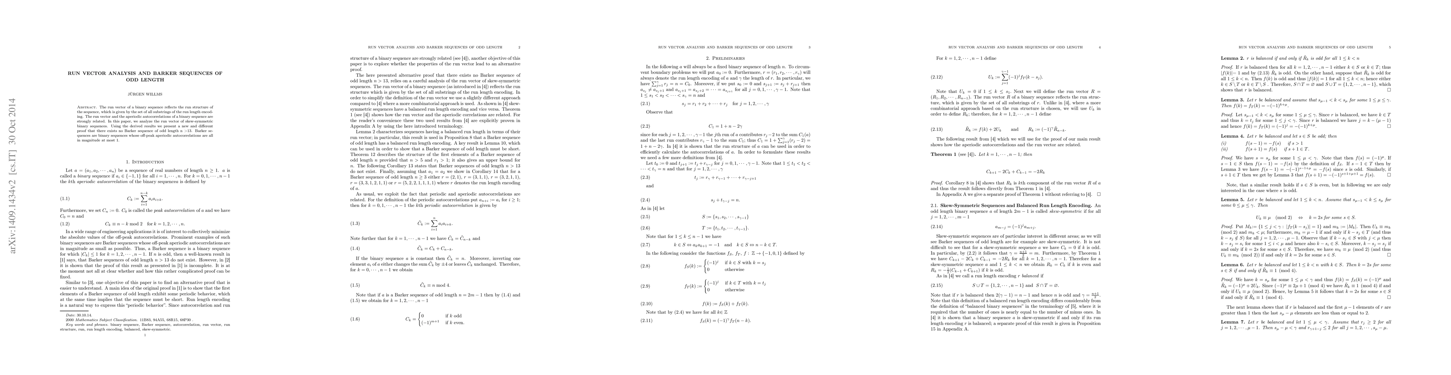 This paper explores the run vector of skew-symmetric binary sequences and demonstrates a new proof that no Barker sequence exists for odd lengths greater than 13. Barker sequences are binary sequences with off-peak aperiodic autocorrelations bounded by 1 in magnitude.