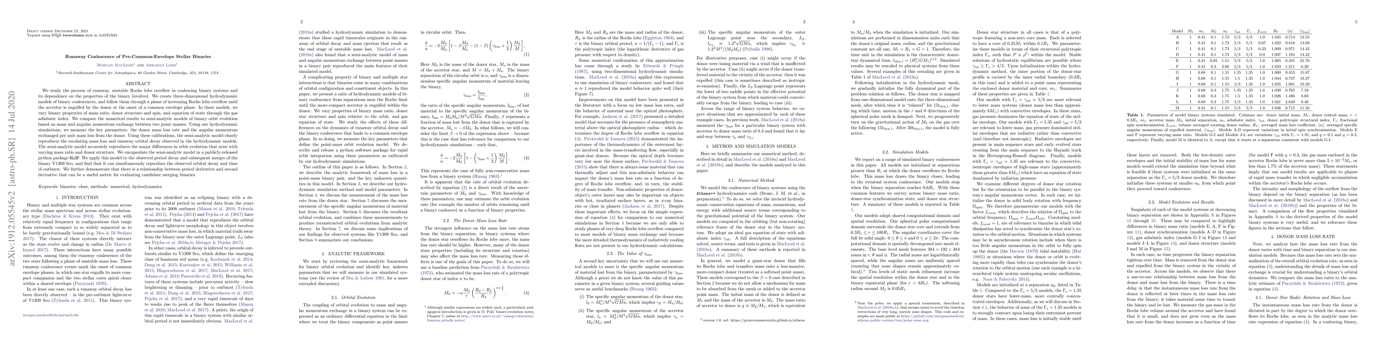 We study the process of runaway, unstable Roche lobe overflow in coalescing binary systems and its dependence on the properties of the binary involved. We create three-dimensional hydrodynamic models of binary coalescences, and follow them through a phase of increasing Roche lobe overflow until the accretor is engulfed by the donor at the onset of a common envelope phase. In these models, we vary binary properties of mass ratio, donor structure and spin, and equation of state through the gas adiabatic index. We compare the numerical results to semi-analytic models of binary orbit evolution based on mass and angular momentum exchange between two point masses. Using our hydrodynamic simulations, we measure the key parameters: the donor mass loss rate and the angular momentum exchanged per unit mass loss from the donor. Using these calibrations, the semi-analytic model closely reproduces the escalating mass loss and runaway orbital decay observed in the hydrodynamic models. The semi-analytic model accurately reproduces the major differences in orbit evolution that arise with varying mass ratio and donor structure. We encapsulate the semi-analytic model in a publicly-released python package RLOF. We apply this model to the observed period decay and subsequent merger of the binary V1309 Sco, and find that it can simultaneously reproduce the observed orbital decay and time of outburst. We further demonstrate that there is a relationship between period derivative and second derivative that can be a useful metric for evaluating candidate merging binaries.