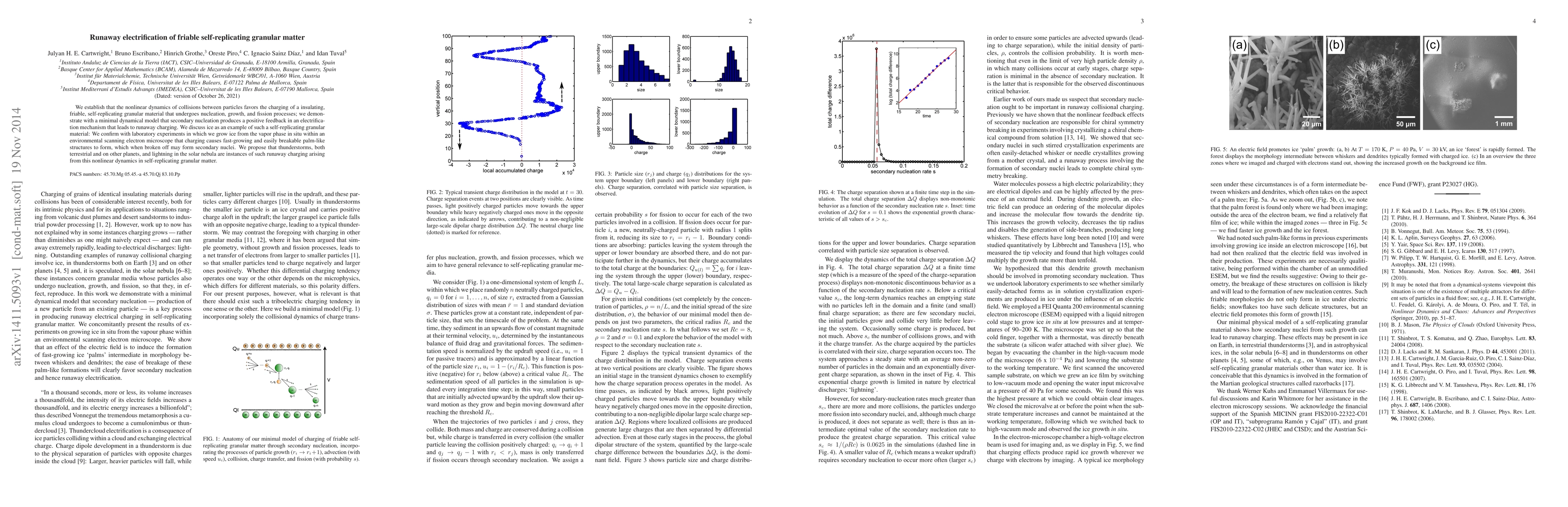 This research demonstrates that the nonlinear dynamics of collisions within insulating, friable, self-replicating granular materials can lead to runaway electrification through a positive feedback mechanism during secondary nucleation. Laboratory experiments on ice confirm this phenomenon, suggesting it may explain natural occurrences like thunderstorms and lightning.