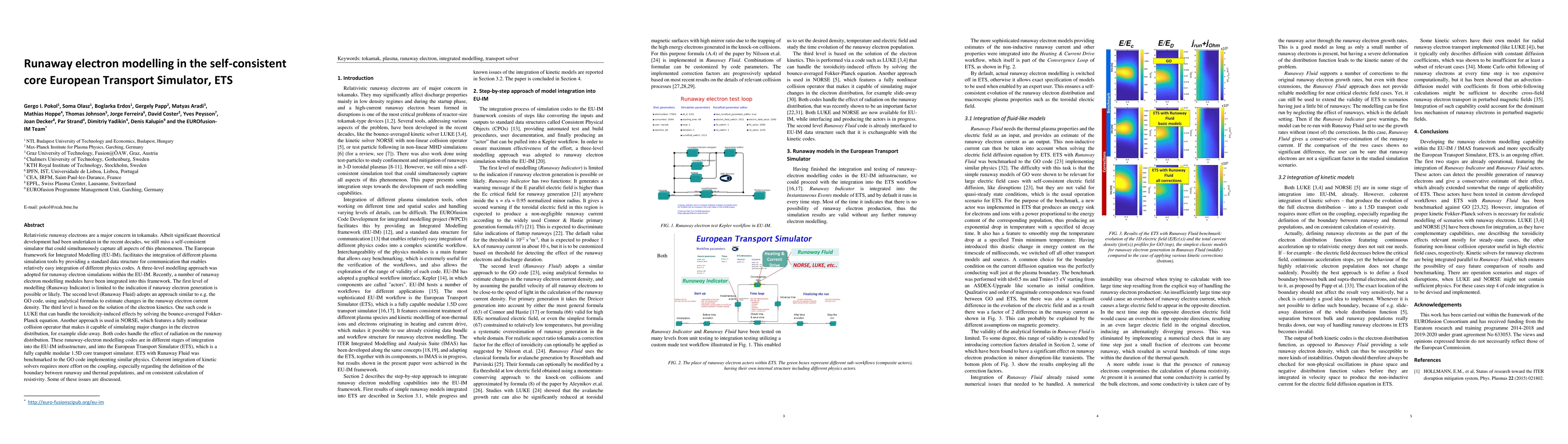 Relativistic runaway electrons are a major concern in tokamaks. The European framework for Integrated Modelling (EU-IM), facilitates the integration of different plasma simulation tools by providing a standard data structure for communication that enables relatively easy integration of different physics codes. A three-level modelling approach was adopted for runaway electron simulations within the EU-IM. Recently, a number of runaway electron modelling modules have been integrated into this framework. The first level of modelling (Runaway Indicator) is limited to the indication if runaway electron generation is possible or likely. The second level (Runaway Fluid) adopts an approach similar to e.g. the GO code, using analytical formulas to estimate changes in the runaway electron current density. The third level is based on the solution of the electron kinetics. One such code is LUKE that can handle the toroidicity-induced effects by solving the bounce-averaged Fokker-Planck equation. Another approach is used in NORSE, which features a fully nonlinear collision operator that makes it capable of simulating major changes in the electron distribution, for example slide-away. Both codes handle the effect of radiation on the runaway distribution. These runaway-electron modelling codes are in different stages of integration into the EU-IM infrastructure, and into the European Transport Simulator (ETS), which is a fully capable modular 1.5D core transport simulator. ETS with Runaway Fluid was benchmarked to the GO code implementing similar physics. Coherent integration of kinetic solvers requires more effort on the coupling, especially regarding the definition of the boundary between runaway and thermal populations, and on consistent calculation of resistivity. Some of these issues are discussed.
