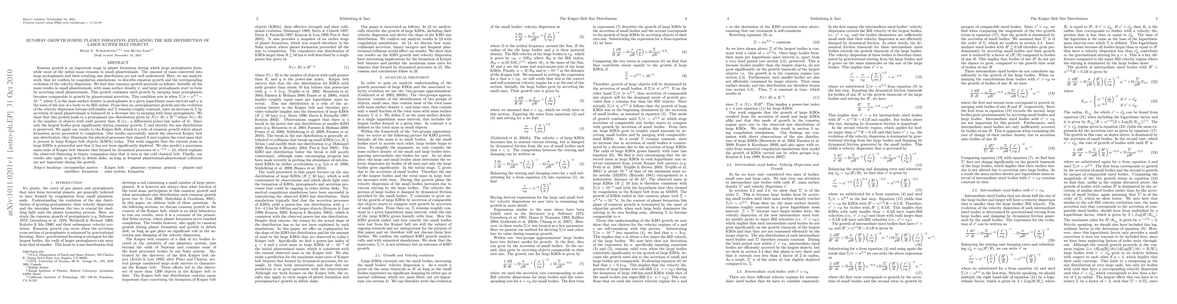 This paper investigates the runaway growth phase in planet formation, explaining the size distribution of large Kuiper Belt Objects (KBOs). The authors find that the growth leads to a protoplanet size distribution following a power-law, matching the observed Kuiper Belt size distribution and suggesting that the current mass in large KBOs is primordial.