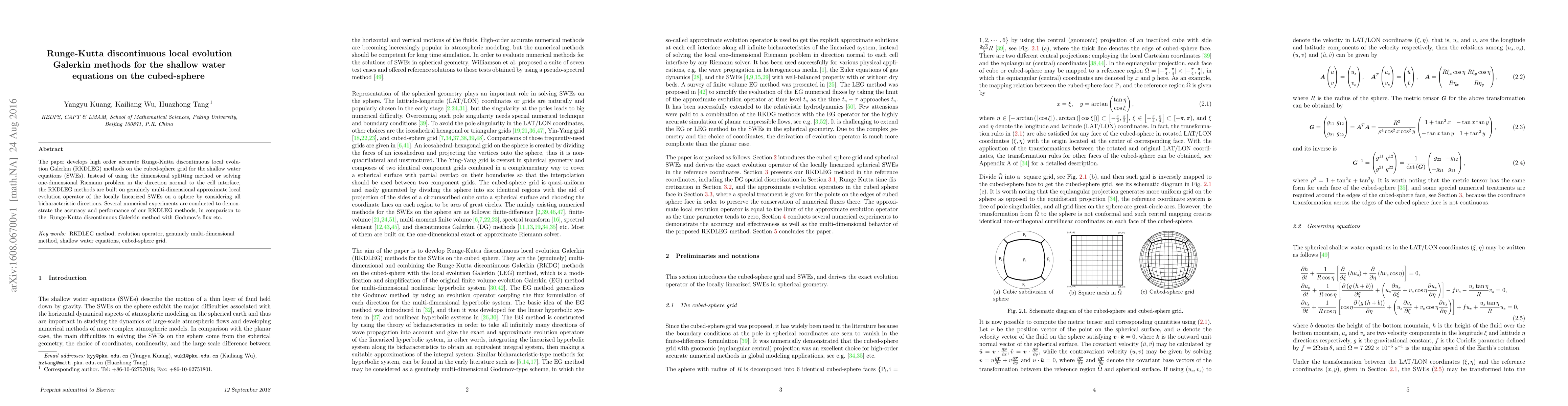 The paper introduces high-order Runge-Kutta discontinuous local evolution Galerkin (RKDLEG) methods for solving the shallow water equations on a cubed-sphere grid, offering a genuinely multi-dimensional approach compared to traditional dimensional splitting methods. Numerical experiments show the accuracy and efficiency of the proposed method relative to existing techniques.