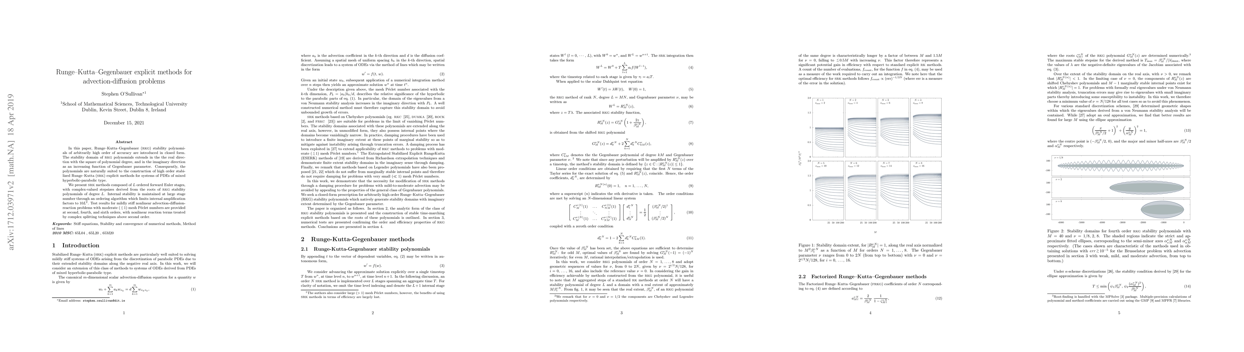 This paper introduces Runge-Kutta-Gegenbauer (RKG) stability polynomials for constructing high-order stabilized Runge-Kutta explicit methods to solve advection-diffusion problems. The methods maintain internal stability through an ordering algorithm, demonstrating effectiveness in mildly stiff nonlinear advection-diffusion-reaction problems at various orders.