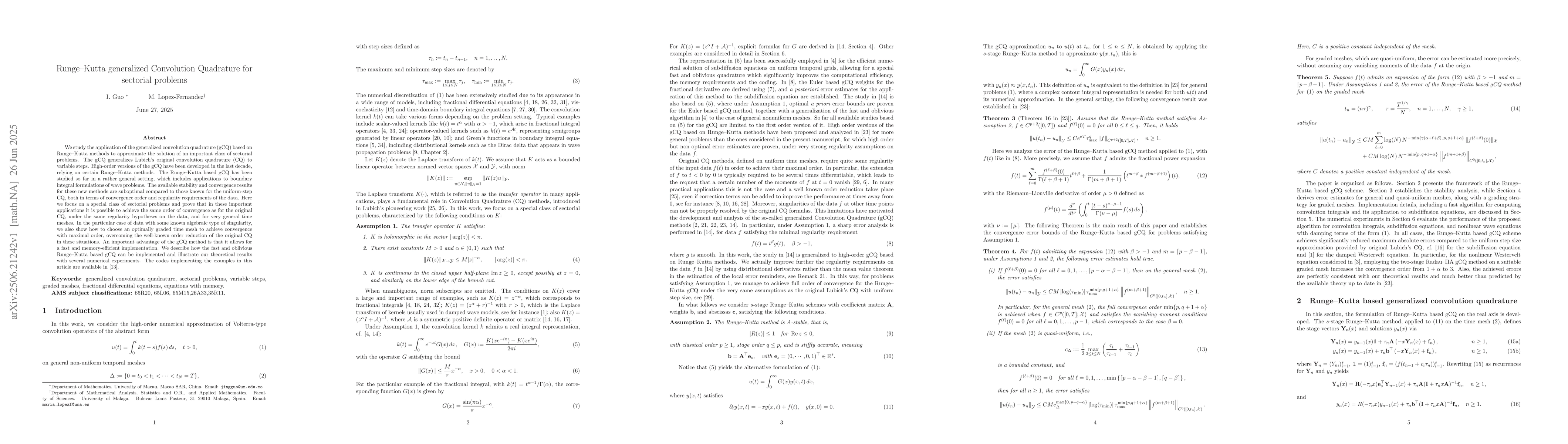 The paper applies Runge--Kutta based generalized convolution quadrature (gCQ) methods to approximate solutions of sectorial problems, including stability and convergence analysis on various mesh types, and implements fast, memory-efficient algorithms.