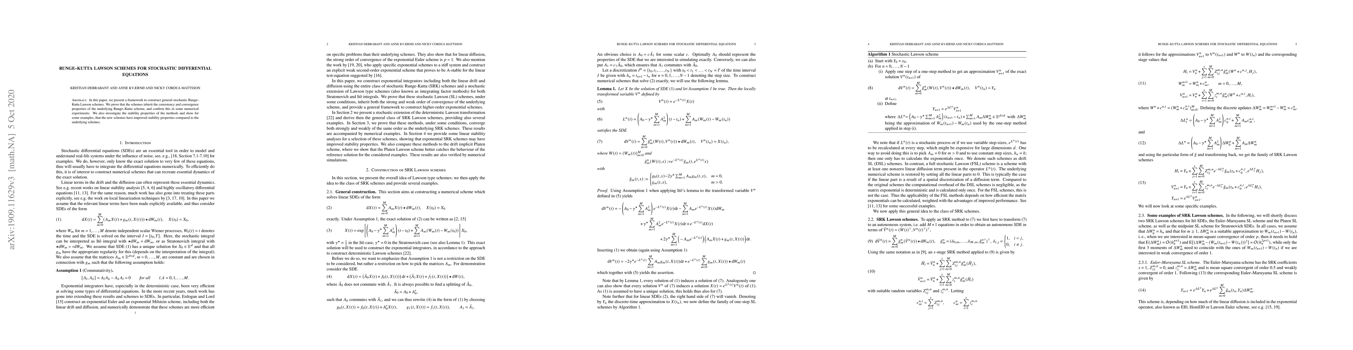 This paper introduces a framework for constructing stochastic Runge-Kutta Lawson schemes, demonstrating their consistency, convergence, and improved stability compared to traditional Runge-Kutta methods, as verified through numerical experiments.