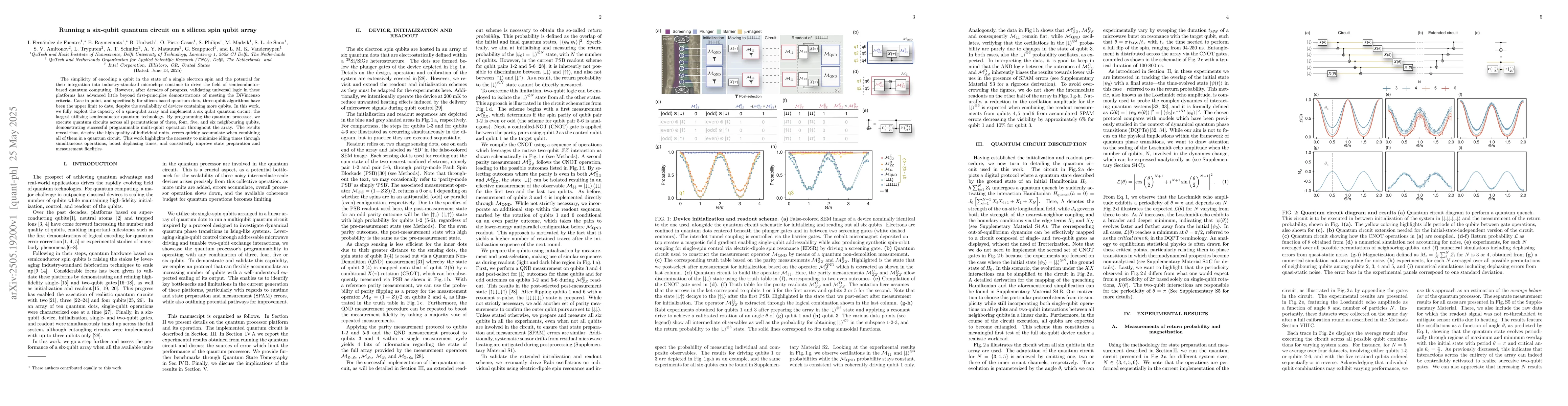 Researchers successfully run a six-qubit quantum circuit on a silicon spin qubit array, demonstrating programmable multi-qubit operation despite accumulating errors when combining individual units. The study highlights the need to minimize idling times, boost dephasing times, and improve state preparation and measurement fidelities.