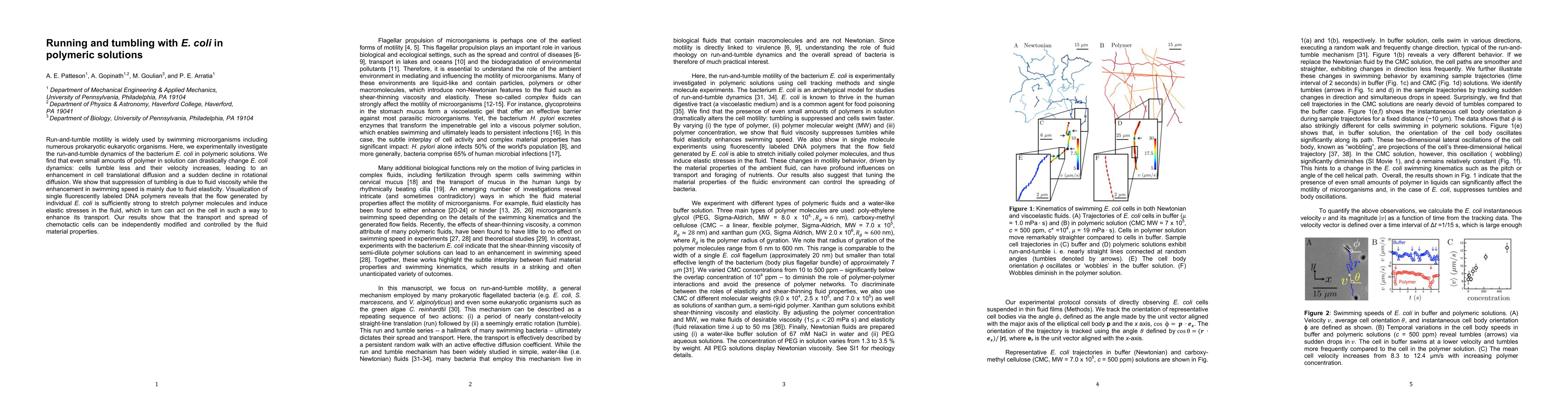 This paper investigates how E. coli's run-and-tumble motility is altered in polymeric solutions, finding that polymers increase cell velocity and diffusion while reducing tumbling, due to fluid viscosity and elasticity. The study highlights the potential to control microbial transport through fluid material properties.