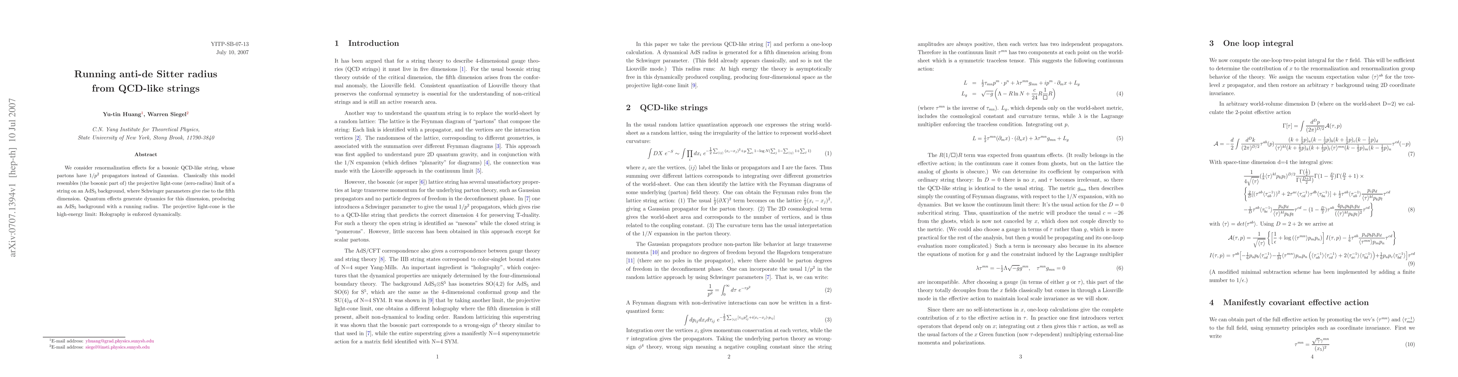 We consider renormalization effects for a bosonic QCD-like string, whose partons have $1/p^{2}$ propagators instead of Gaussian. Classically this model resembles (the bosonic part of) the projective light-cone (zero-radius) limit of a string on an AdS${}_5$ background, where Schwinger parameters give rise to the fifth dimension. Quantum effects generate dynamics for this dimension, producing an AdS${}_5$ background with a running radius. The projective light-cone is the high-energy limit: Holography is enforced dynamically.