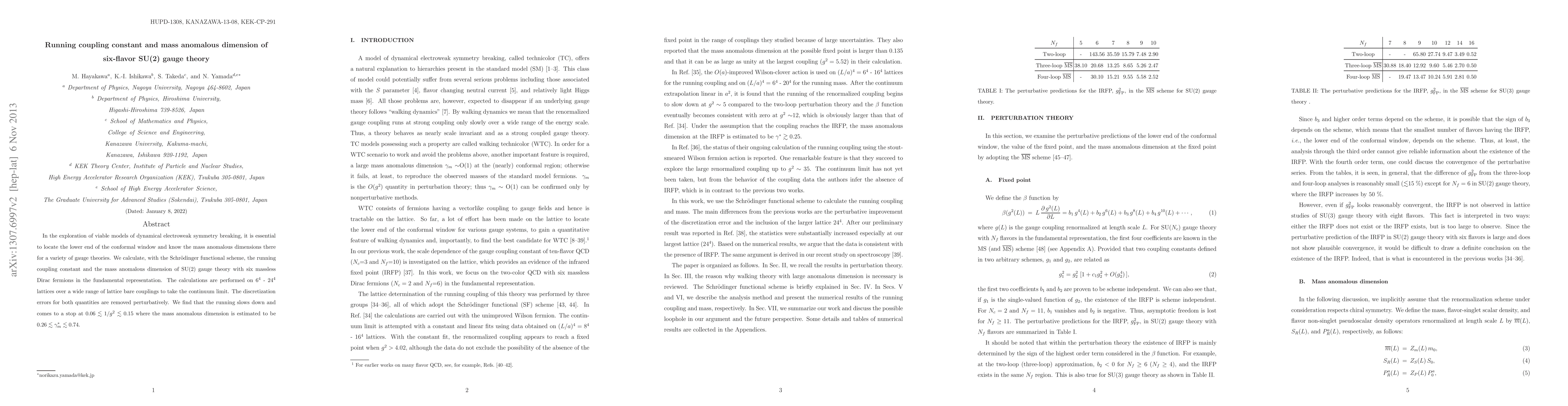 In the exploration of viable models of dynamical electroweak symmetry breaking, it is essential to locate the lower end of the conformal window and know the mass anomalous dimensions there for a variety of gauge theories. We calculate, with the Schr\"odinger functional scheme, the running coupling constant and the mass anomalous dimension of SU(2) gauge theory with six massless Dirac fermions in the fundamental representation. The calculations are performed on $6^4$ - $24^4$ lattices over a wide range of lattice bare couplings to take the continuum limit. The discretization errors for both quantities are removed perturbatively. We find that the running slows down and comes to a stop at $0.06 \lesssim 1/g^2 \lesssim 0.15$ where the mass anomalous dimension is estimated to be $0.26 \lesssim \gamma^*_m \lesssim 0.74$.