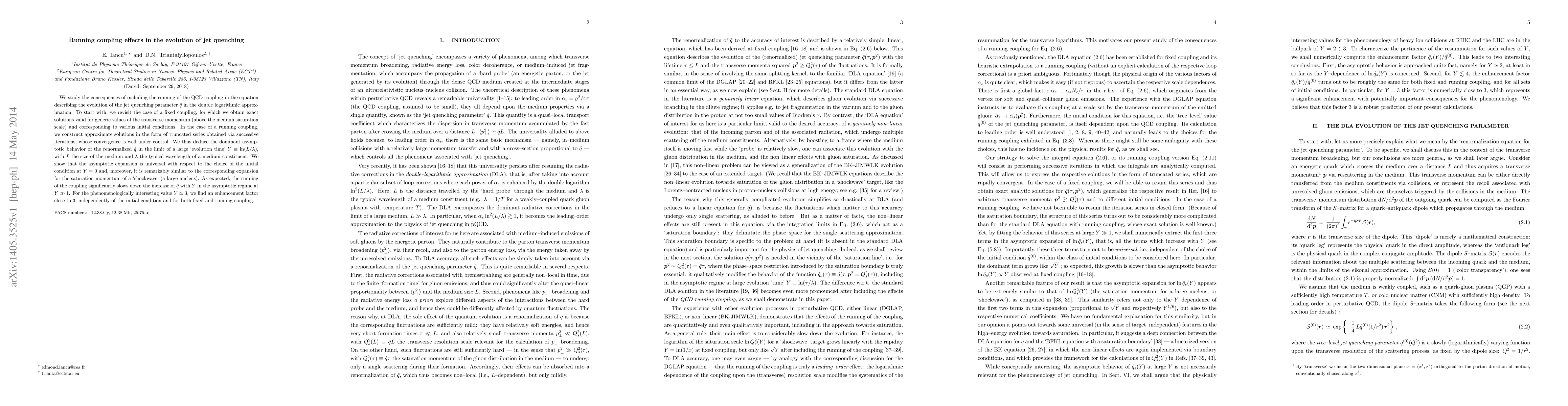 We study the consequences of including the running of the QCD coupling in the equation describing the evolution of the jet quenching parameter $\hat q$ in the double logarithmic approximation. To start with, we revisit the case of a fixed coupling, for which we obtain exact solutions valid for generic values of the transverse momentum (above the medium saturation scale) and corresponding to various initial conditions. In the case of a running coupling, we construct approximate solutions in the form of truncated series obtained via successive iterations, whose convergence is well under control. We thus deduce the dominant asymptotic behavior of the renormalized $\hat q$ in the limit of a large evolution time $Y\equiv\ln(L/\lambda)$, with $L$ the size of the medium and $\lambda$ the typical wavelength of a medium constituent. We show that the asymptotic expansion is universal with respect to the choice of the initial condition at $Y=0$ and, moreover, it is remarkably similar to the corresponding expansion for the saturation momentum of a shockwave (a large nucleus). As expected, the running of the coupling significantly slows down the increase of $\hat q$ with $Y$ in the asymptotic regime at $Y\gg 1$. For the phenomenologically interesting value $Y\simeq 3$, we find an enhancement factor close to 3, independently of the initial condition and for both fixed and running coupling.