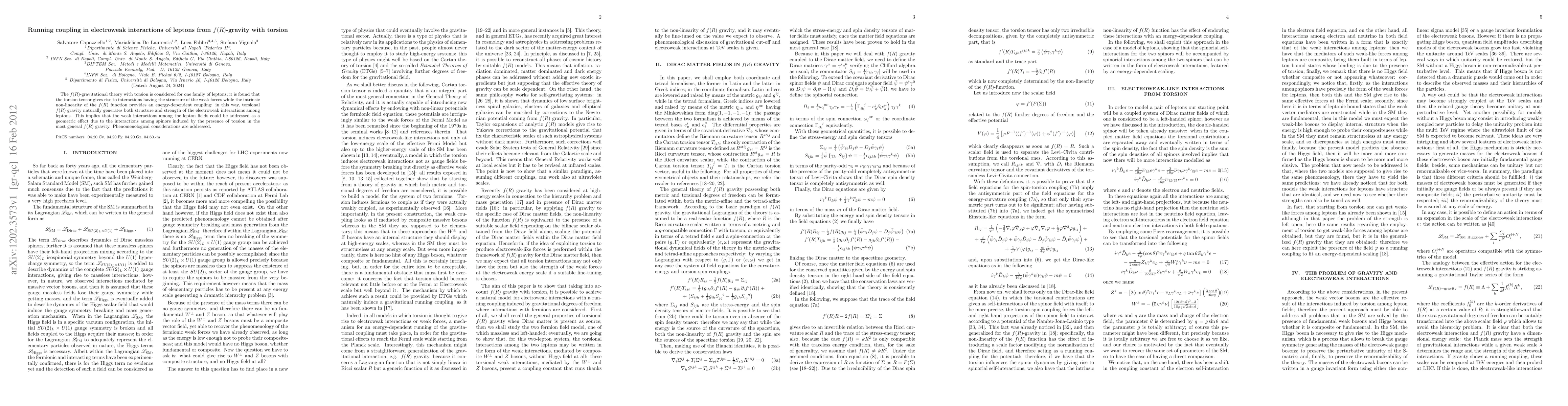 This paper explores the f(R)-gravity theory with torsion for leptons, demonstrating that torsion tensors generate weak force interactions and the non-linearity of f(R) leads to an energy-dependent coupling, thus naturally explaining the electroweak interactions. The study suggests that weak interactions among leptons arise geometrically from spinor interactions induced by torsion in f(R) gravity.