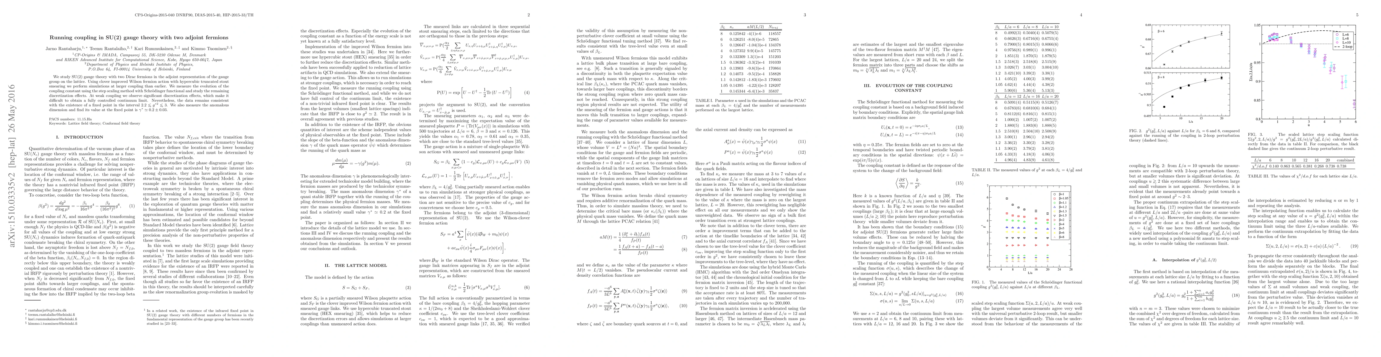 We study SU(2) gauge theory with two Dirac fermions in the adjoint representation of the gauge group on the lattice. Using clover improved Wilson fermion action with hypercubic truncated stout smearing we perform simulations at larger coupling than earlier. We measure the evolution of the coupling constant using the step scaling method with Schr\"odinger functional and study the remaining discretization effects. At weak coupling we observe significant discretization effects, which make it difficult to obtain a fully controlled continuum limit. Nevertheless, the data remains consistent with the existence of a fixed point in the interval $2.2\lesssim g^{\ast 2}\lesssim 3$. We also measure the anomalous dimension and find its value at the fixed point is $\gamma^\ast\simeq 0.2\pm 0.03$.