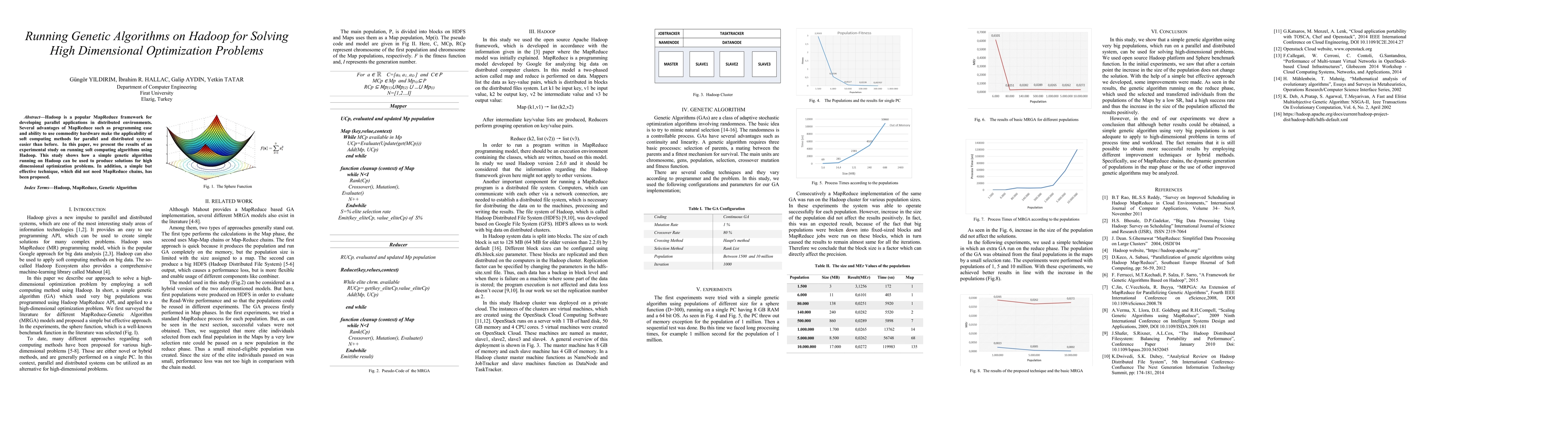 This paper explores the use of Hadoop's MapReduce framework to parallelize and distribute genetic algorithms for solving high dimensional optimization problems. The study demonstrates a straightforward technique for implementing genetic algorithms on Hadoop without requiring complex MapReduce chains.