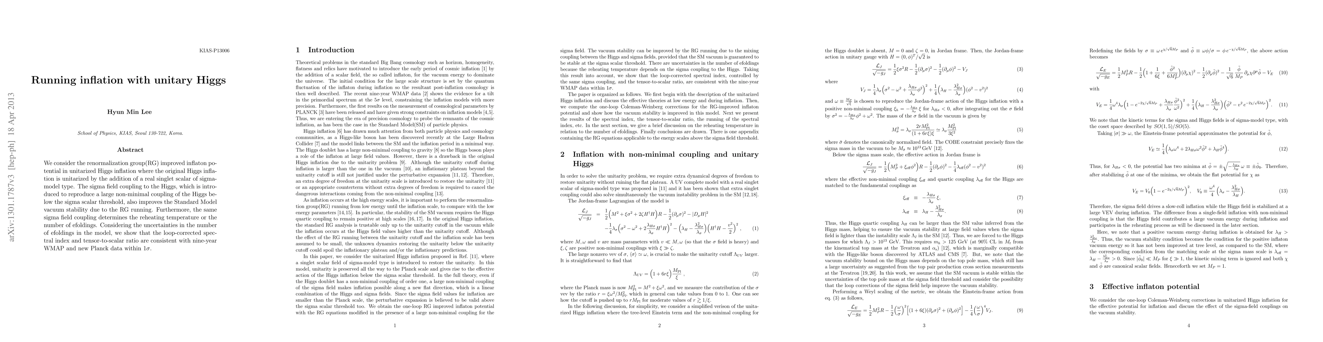 The paper proposes a unitarized Higgs inflation model with added sigma field that improves Standard Model vacuum stability and predicts consistent spectral index and tensor-to-scalar ratio values with 9-year WMAP and new Planck data.