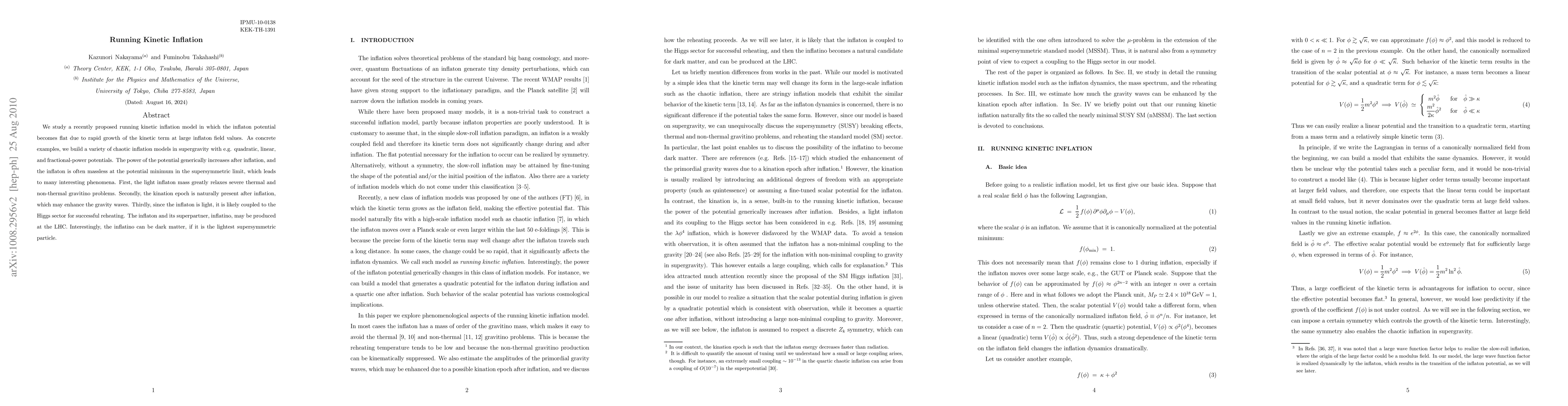 We study a recently proposed running kinetic inflation model in which the inflaton potential becomes flat due to rapid growth of the kinetic term at large inflaton field values. As concrete examples, we build a variety of chaotic inflation models in supergravity with e.g. quadratic, linear, and fractional-power potentials. The power of the potential generically increases after inflation, and the inflaton is often massless at the potential minimum in the supersymmetric limit, which leads to many interesting phenomena. First, the light inflaton mass greatly relaxes severe thermal and non-thermal gravitino problems. Secondly, the kination epoch is naturally present after inflation, which may enhance the gravity waves. Thirdly, since the inflaton is light, it is likely coupled to the Higgs sector for successful reheating. The inflaton and its superpartner, inflatino, may be produced at the LHC. Interestingly, the inflatino can be dark matter, if it is the lightest supersymmetric particle.