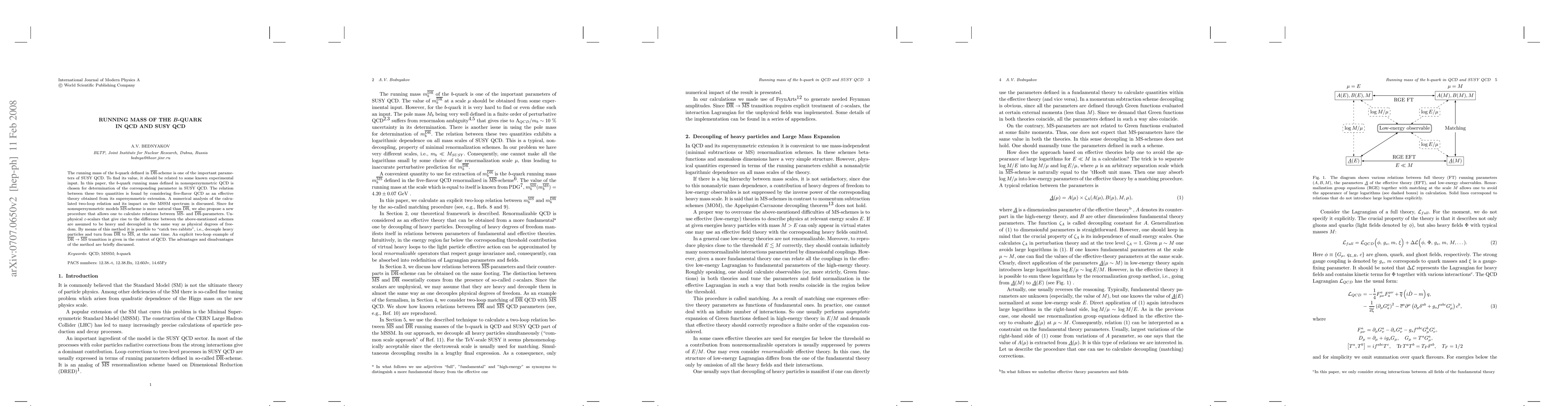 The running mass of the b-quark defined in DRbar-scheme is one of the important parameters of SUSY QCD. To find its value it should be related to some known experimental input. In this paper the b-quark running mass defined in nonsupersymmetric QCD is chosen for determination of corresponding parameter in SUSY QCD. The relation between these two quantities is found by considering five-flavor QCD as an effective theory obtained from its supersymmetric extension. A numerical analysis of the calculated two-loop relation and its impact on the MSSM spectrum is discussed. Since for nonsupersymmetric models MSbar-scheme is more natural than DRbar, we also propose a new procedure that allows one to calculate relations between MSbar- and DRbar-parameters. Unphysical epsilon-scalars that give rise to the difference between mentioned schemes are assumed to be heavy and decoupled in the same way as physical degrees of freedom. By means of this method it is possible to ``catch two rabbits'', i.e., decouple heavy particles and turn from DRbar to MSbar, at the same time. Explicit two-loop example of DRbar -> MSbar transition is given in the context of QCD. The advantages and disadvantages of the method are briefly discussed.