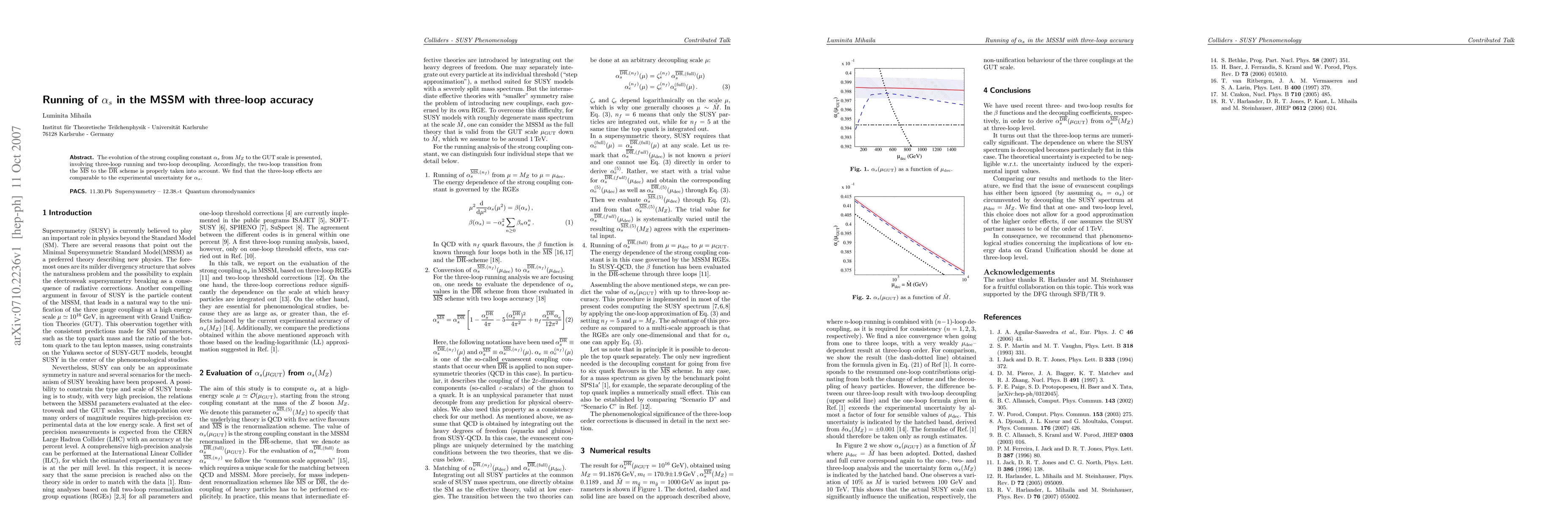 The evolution of the strong coupling constant $\alpha_s$ from $M_Z$ to the GUT scale is presented, involving three-loop running and two-loop decoupling. Accordingly, the two-loop transition from the $\bar{\rm MS}$ to the $\bar{\rm DR}$ scheme is properly taken into account. We find that the three-loop effects are comparable to the experimental uncertainty for $\alpha_s$.