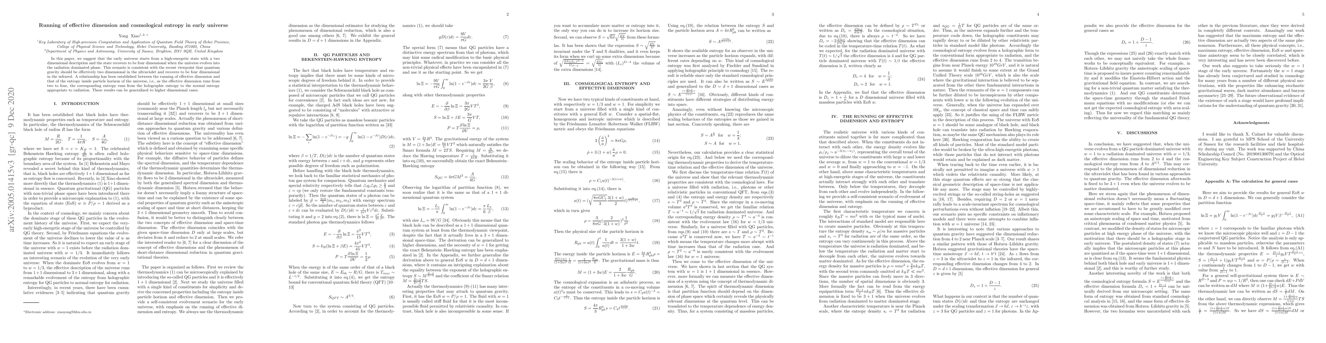 In this paper, we suggest that the early universe starts from a high-energetic state with a two dimensional description and the state recovers to be four dimensional when the universe evolves into the radiation dominated phase. This scenario is consistent with the recent viewpoint that quantum gravity should be effectively two dimensional in the ultraviolet and recovers to be four dimensional in the infrared. A relationship has been established between the running of effective dimension and that of the entropy inside particle horizon of the universe, i.e., as the effective dimension runs from two to four, the corresponding entropy runs from the holographic entropy to the normal entropy appropriate to radiation. These results can be generalized to higher dimensional cases.
