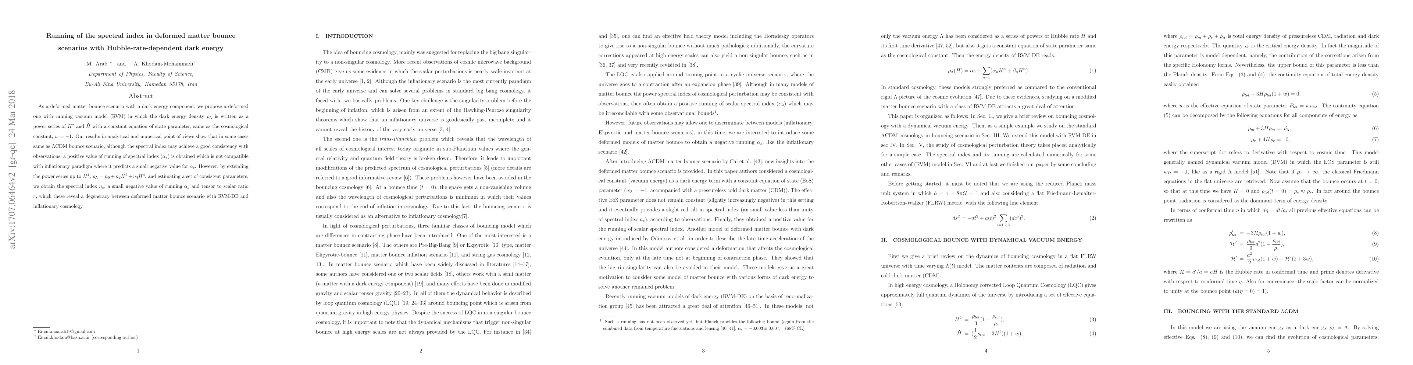 As a deformed matter bounce scenario with a dark energy component we propose a deformed one with running vacuum model (RVM) in which the dark energy density is written as a power series of $H^2$ and $\dot H$ with a constant equation of state parameter same as the cosmological constant. Our results in analytical and numerical point of views show that in some cases same as LCDM bounce scenario, although the spectral index may achieve a good consistency with observations, a positive value of running of spectral index is obtained which is not compatible with inflationary paradigm where it predicts a small negative value for $\alpha_s$. However, by extending the power series up to $H^4$, $\rho_{\Lambda}=n_0+n_2 H^2+n_4 H^4$, and estimating a set of consistent parameters, we obtain the spectral index $n_s$, a small negative value of running $\alpha_s$ and tensor to scalar ratio $r$, which these reval a degeneracy between deformed matter bounce scenario with RVM-DE and inflationary cosmology.