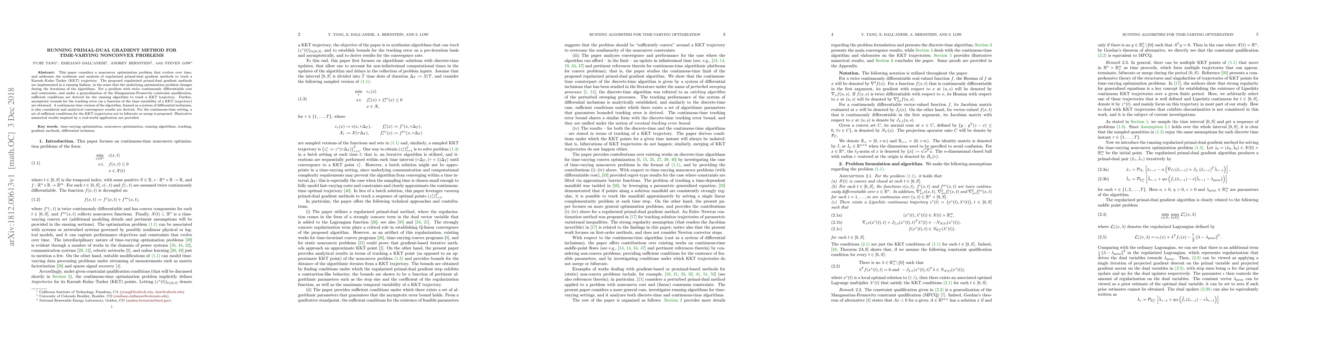 This paper considers a nonconvex optimization problem that evolves over time, and addresses the synthesis and analysis of regularized primal-dual gradient methods to track a Karush-Kuhn-Tucker (KKT) trajectory. The proposed regularized primal-dual gradient methods are implemented in a running fashion, in the sense that the underlying optimization problem changes during the iterations of the algorithms. For a problem with twice continuously differentiable cost and constraints, and under a generalization of the Mangasarian-Fromovitz constraint qualification, sufficient conditions are derived for the running algorithm to track a KKT trajectory. Further, asymptotic bounds for the tracking error (as a function of the time-variability of a KKT trajectory) are obtained. A continuous-time version of the algorithm, framed as a system of differential inclusions, is also considered and analytical convergence results are derived. For the continuous-time setting, a set of sufficient conditions for the KKT trajectories not to bifurcate or merge is proposed. Illustrative numerical results inspired by a real-world application are provided.