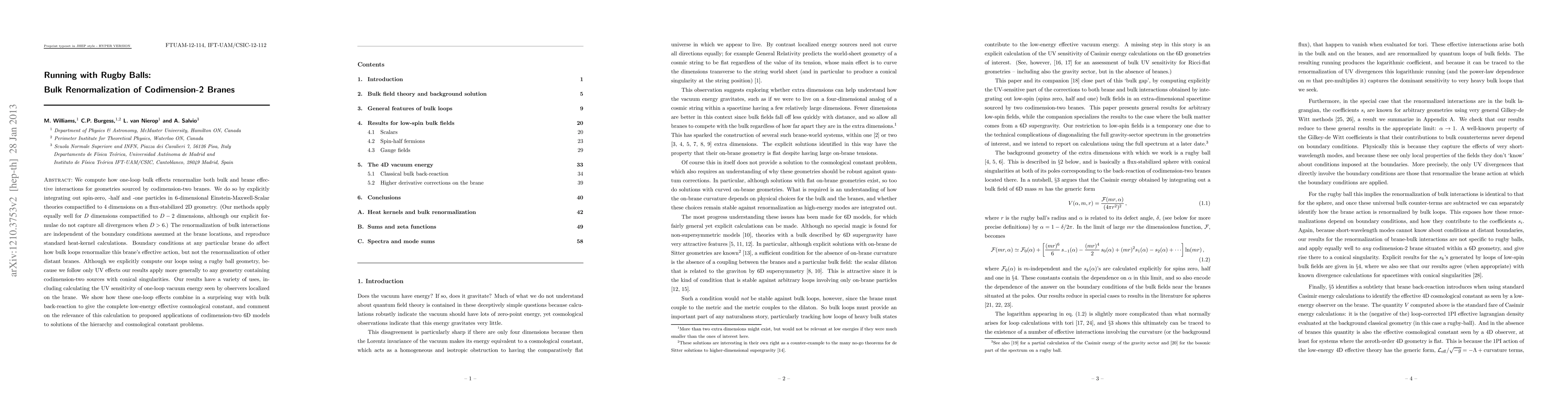 We compute how one-loop bulk effects renormalize both bulk and brane effective interactions for geometries sourced by codimension-two branes. We do so by explicitly integrating out spin-zero, -half and -one particles in 6-dimensional Einstein-Maxwell-Scalar theories compactified to 4 dimensions on a flux-stabilized 2D geometry. (Our methods apply equally well for D dimensions compactified to D-2 dimensions, although our explicit formulae do not capture all divergences when D>6.) The renormalization of bulk interactions are independent of the boundary conditions assumed at the brane locations, and reproduce standard heat-kernel calculations. Boundary conditions at any particular brane do affect how bulk loops renormalize this brane's effective action, but not the renormalization of other distant branes. Although we explicitly compute our loops using a rugby ball geometry, because we follow only UV effects our results apply more generally to any geometry containing codimension-two sources with conical singularities. Our results have a variety of uses, including calculating the UV sensitivity of one-loop vacuum energy seen by observers localized on the brane. We show how these one-loop effects combine in a surprising way with bulk back-reaction to give the complete low-energy effective cosmological constant, and comment on the relevance of this calculation to proposed applications of codimension-two 6D models to solutions of the hierarchy and cosmological constant problems.