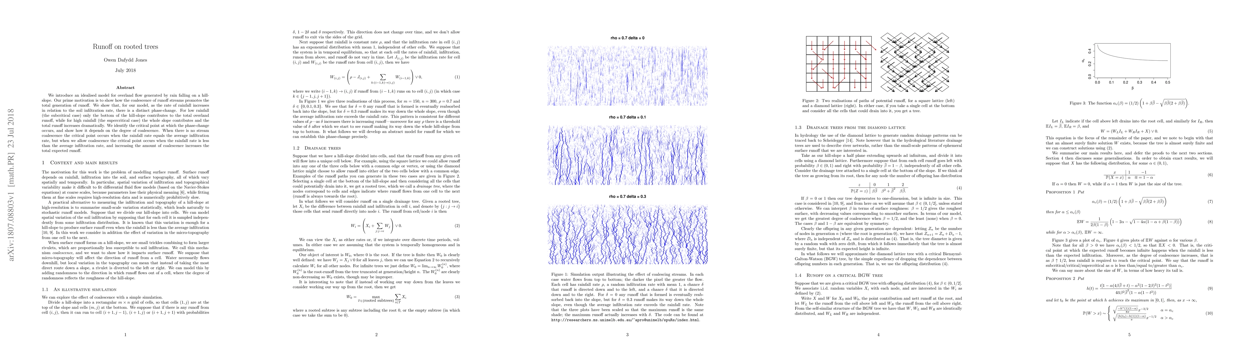 We introduce an idealised model for overland flow generated by rain falling on a hill-slope. Our prime motivation is to show how the coalescence of runoff streams promotes the total generation of runoff. We show that, for our model, as the rate of rainfall increases in relation to the soil infiltration rate, there is a distinct phase-change. For low rainfall (the subcritical case) only the bottom of the hill-slope contributes to the total overland runoff, while for high rainfall (the supercritical case) the whole slope contributes and the total runoff increases dramatically. We identify the critical point at which the phase-change occurs, and show how it depends on the degree of coalescence. When there is no stream coalescence the critical point occurs when the rainfall rate equals the average infiltration rate, but when we allow coalescence the critical point occurs when the rainfall rate is less than the average infiltration rate, and increasing the amount of coalescence increases the total expected runoff.