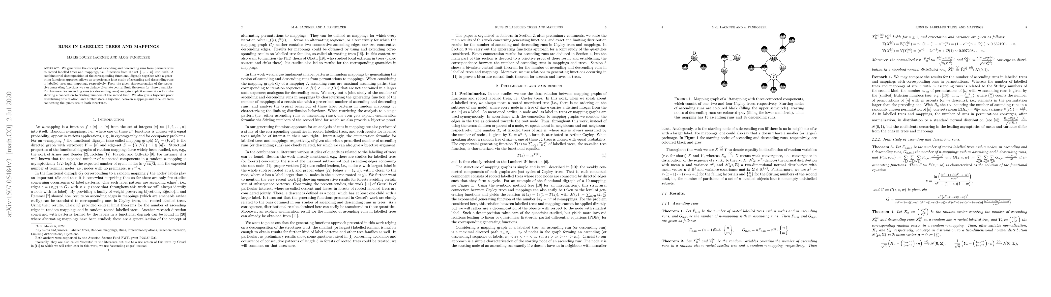 This paper generalizes the concept of runs from permutations to rooted labelled trees and mappings, providing a combinatorial decomposition and generating functions approach. It deduces bivariate central limit theorems and explicit enumeration formulae linked to Stirling numbers, along with a bijective proof and a connection between mappings and labelled trees.