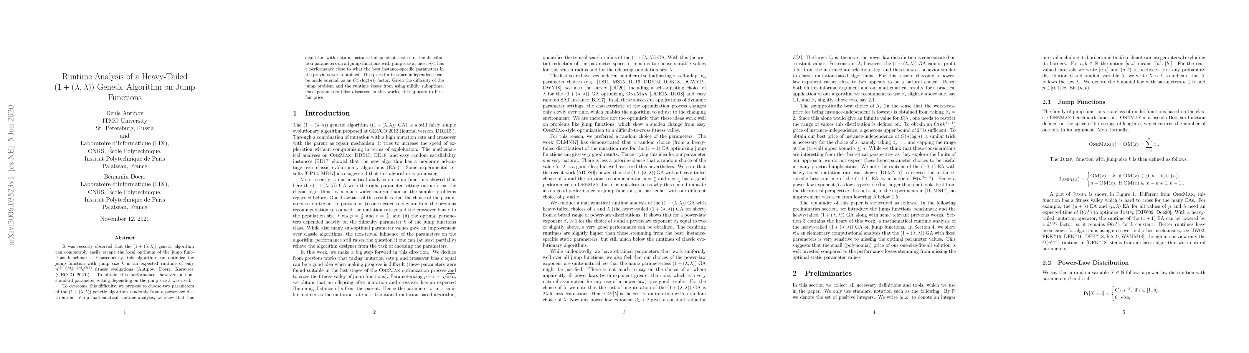 It was recently observed that the $(1+(\lambda,\lambda))$ genetic algorithm can comparably easily escape the local optimum of the jump functions benchmark. Consequently, this algorithm can optimize the jump function with jump size $k$ in an expected runtime of only $n^{(k + 1)/2}k^{-k/2}e^{O(k)}$ fitness evaluations (Antipov, Doerr, Karavaev (GECCO 2020)). To obtain this performance, however, a non-standard parameter setting depending on the jump size $k$ was used. To overcome this difficulty, we propose to choose two parameters of the $(1+(\lambda,\lambda))$ genetic algorithm randomly from a power-law distribution. Via a mathematical runtime analysis, we show that this algorithm with natural instance-independent choices of the distribution parameters on all jump functions with jump size at most $n/4$ has a performance close to what the best instance-specific parameters in the previous work obtained. This price for instance-independence can be made as small as an $O(n\log(n))$ factor. Given the difficulty of the jump problem and the runtime losses from using mildly suboptimal fixed parameters (also discussed in this work), this appears to be a fair price.