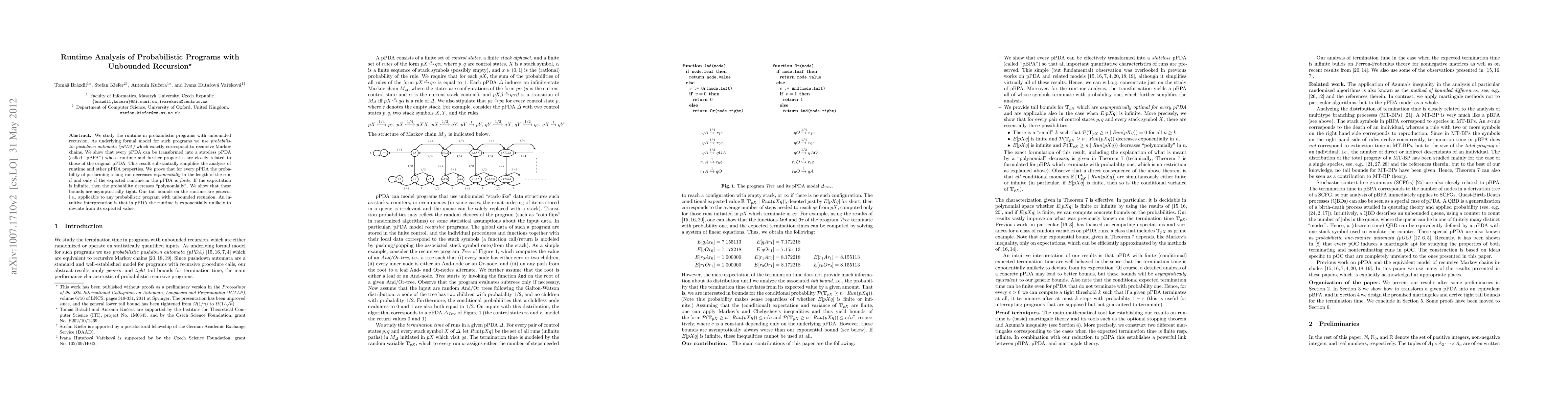 This paper analyzes the runtime characteristics of probabilistic programs with unbounded recursion, employing probabilistic pushdown automata (pPDA) as a formal model. It provides tail bounds for termination time and recurrence time bounds for non-terminating probabilistic recursive programs, focusing on the frequency of long request-service cycles in daemons and servers.