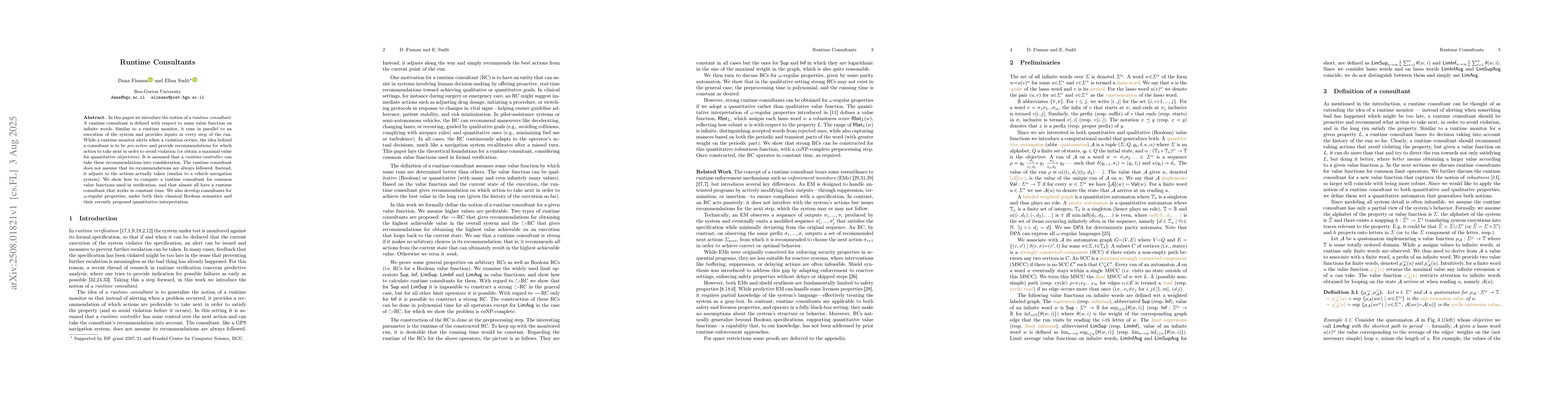 This paper introduces 'runtime consultants' that provide real-time recommendations to systems to avoid violations or optimize performance, based on value functions. It shows that most common verification value functions have constant-time consultants, and extends this to $omega$-regular properties under both Boolean and quantitative semantics. The consultants adjust to actual system actions, much like a navigation system.