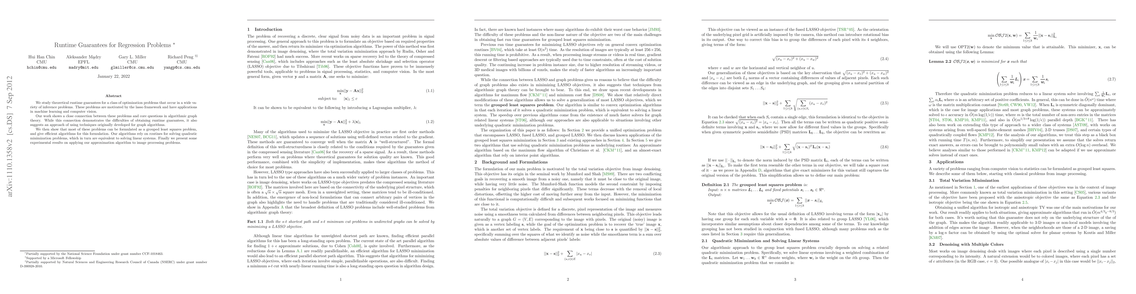 We study theoretical runtime guarantees for a class of optimization problems that occur in a wide variety of inference problems. these problems are motivated by the lasso framework and have applications in machine learning and computer vision. Our work shows a close connection between these problems and core questions in algorithmic graph theory. While this connection demonstrates the difficulties of obtaining runtime guarantees, it also suggests an approach of using techniques originally developed for graph algorithms. We then show that most of these problems can be formulated as a grouped least squares problem, and give efficient algorithms for this formulation. Our algorithms rely on routines for solving quadratic minimization problems, which in turn are equivalent to solving linear systems. Finally we present some experimental results on applying our approximation algorithm to image processing problems.