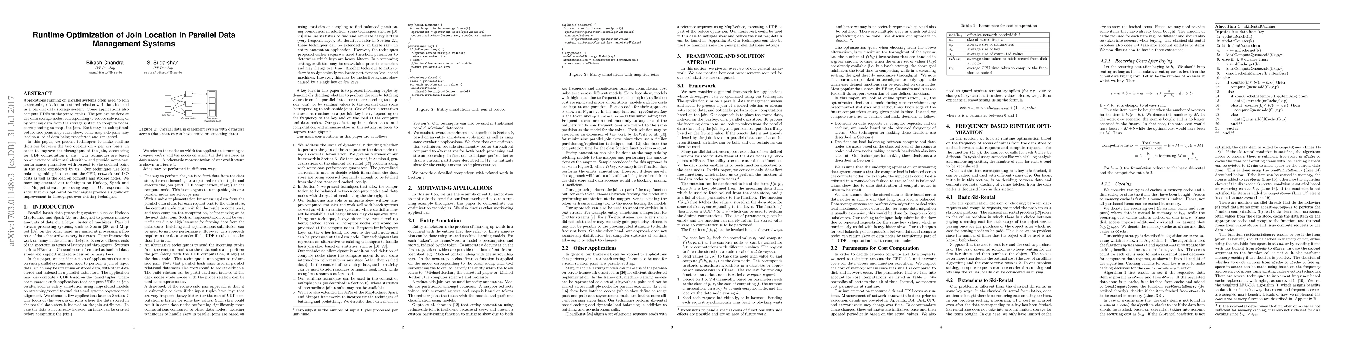 This paper proposes runtime optimization techniques for join location in parallel data management systems, offering dynamic decisions between map side and reduce side joins based on extended ski-rental algorithm. These techniques improve throughput by balancing CPU, network, I/O, and node load, showing significant performance gains over existing methods in Hadoop, Spark, and Muppet environments.