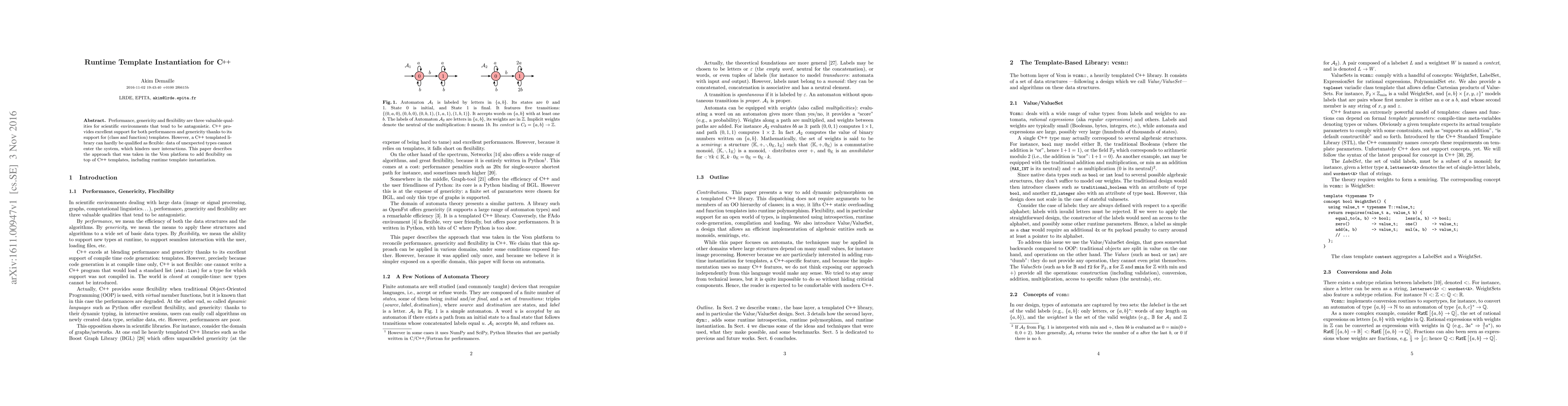 This paper proposes a method for implementing runtime template instantiation in C++ to enhance flexibility, allowing data of unexpected types to enter the system, thereby addressing the limitations of static template instantiation in providing user interactions. The approach is demonstrated within the Vcsn platform.