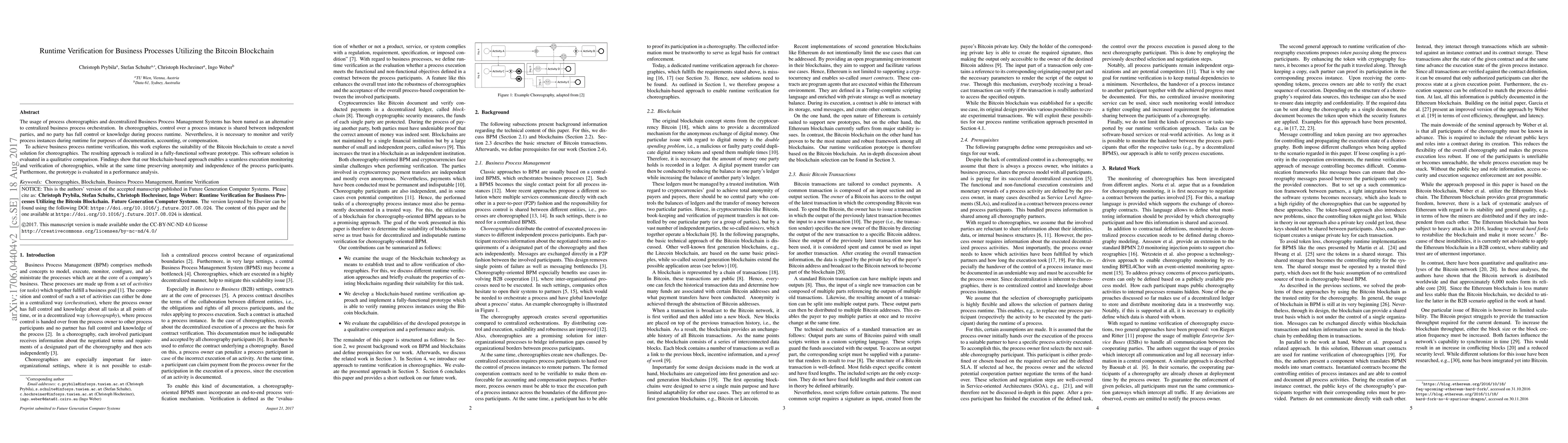The usage of process choreographies and decentralized Business Process Management Systems has been named as an alternative to centralized business process orchestration. In choreographies, control over a process instance is shared between independent parties, and no party has full control or knowledge during process runtime. Nevertheless, it is necessary to monitor and verify process instances during runtime for purposes of documentation, accounting, or compensation. To achieve business process runtime verification, this work explores the suitability of the Bitcoin blockchain to create a novel solution for choreographies. The resulting approach is realized in a fully-functional software prototype. This software solution is evaluated in a qualitative comparison. Findings show that our blockchain-based approach enables a seamless execution monitoring and verification of choreographies, while at the same time preserving anonymity and independence of the process participants. Furthermore, the prototype is evaluated in a performance analysis.