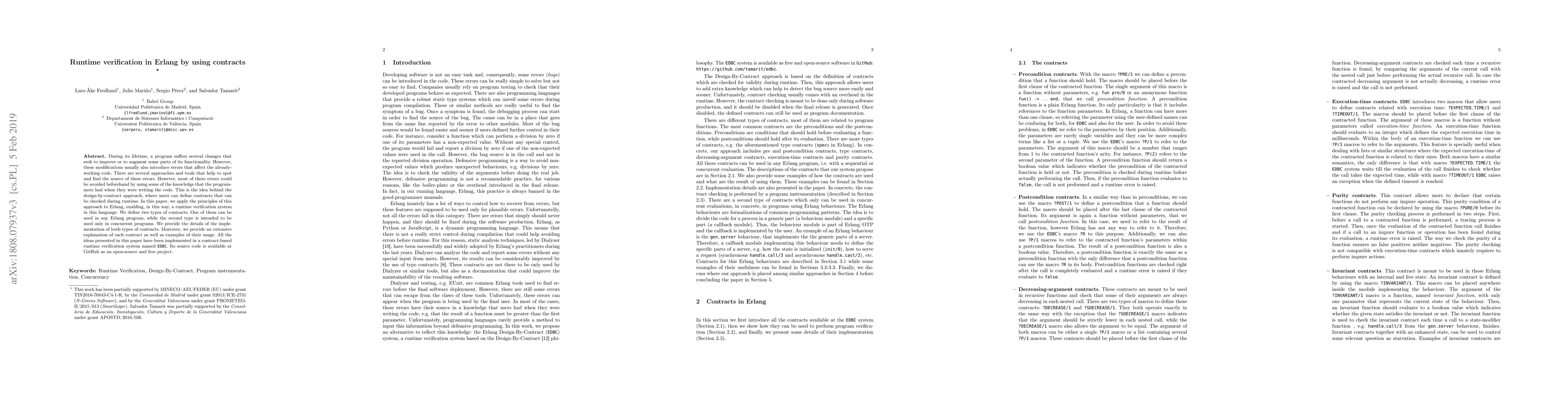 This paper proposes a runtime verification system for Erlang using design-by-contract principles, defining two types of contracts: one for general use and another specifically for concurrent programs. The system, named EDBC, is implemented as an open-source project with detailed explanations and examples of contract usage.